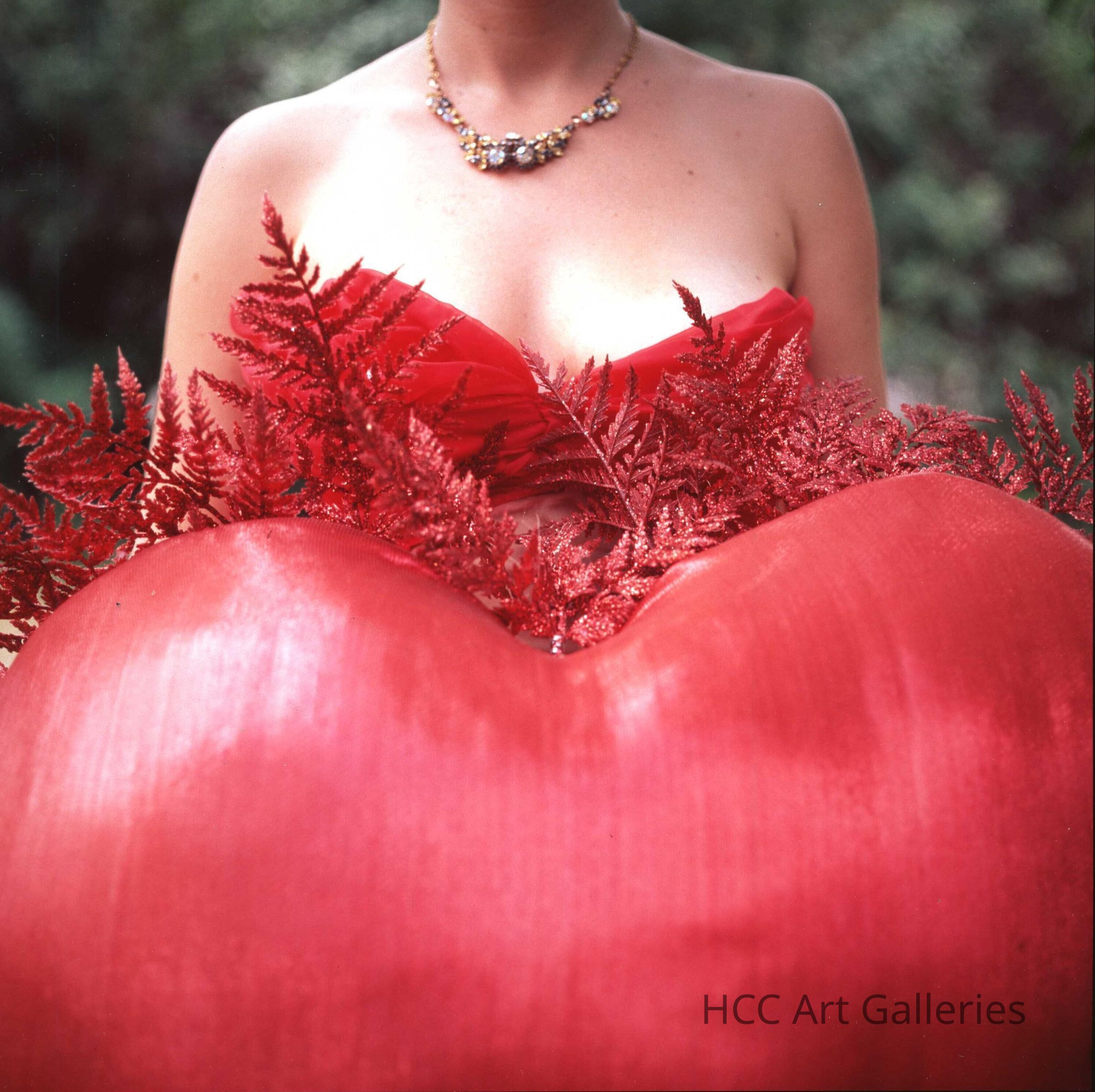 Caucasian woman in a red dress holding a large red heart decoration with red ferns attached, image cropped to torso.Photograph Details