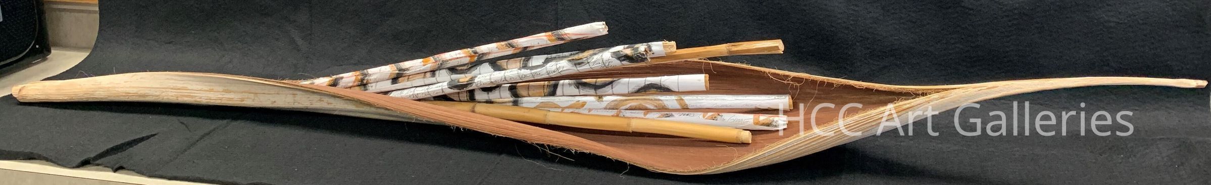 A large, sturdy plant leaf/shell containing sticks of, what appear to be, bamboo that are adorned with white paint and black charcoal.Collection