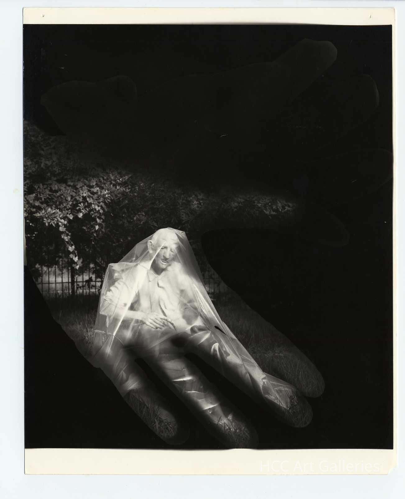 A silhouette of a hand on a black background. Inside the hand silhouette is a person wearing an elderly male mask, sitting in the grass, under mesh fabric.Photograph Details