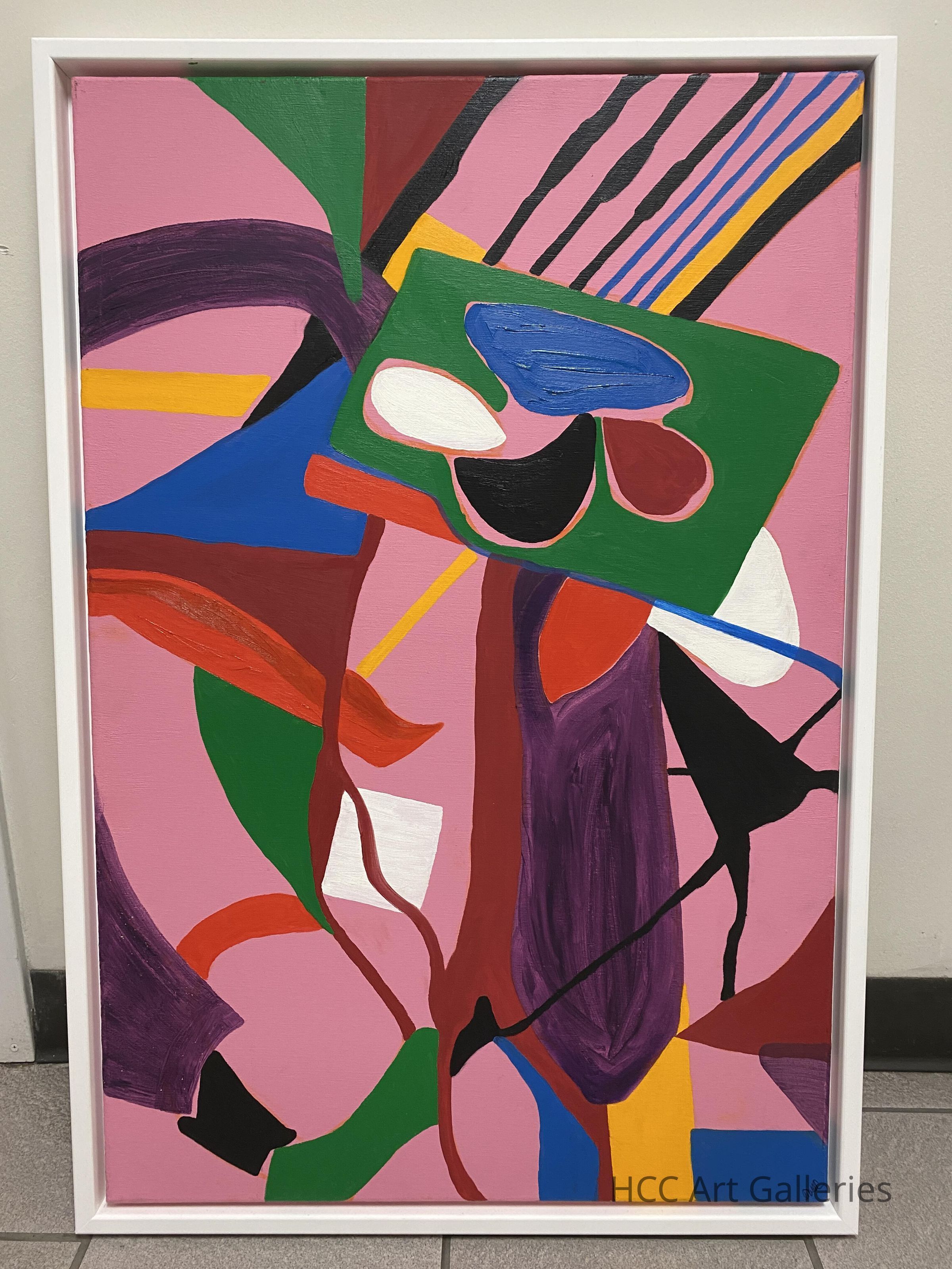 Pink is the prominent color in this piece, and throughout are irregular shapes and line. The top-center of the painting features a green rhombus-like shape that contains four other shapes in black, maroon, blue, and white. Lines of black, blue, and yellow intercept this shape form the top right corner. Below the green shape is long purple, maroon, and black shapes that continue to the bottom of the canvas. The bottom right corner has a blue rectangle shape that is perpendicular to a yellow rectangle shape.Collection