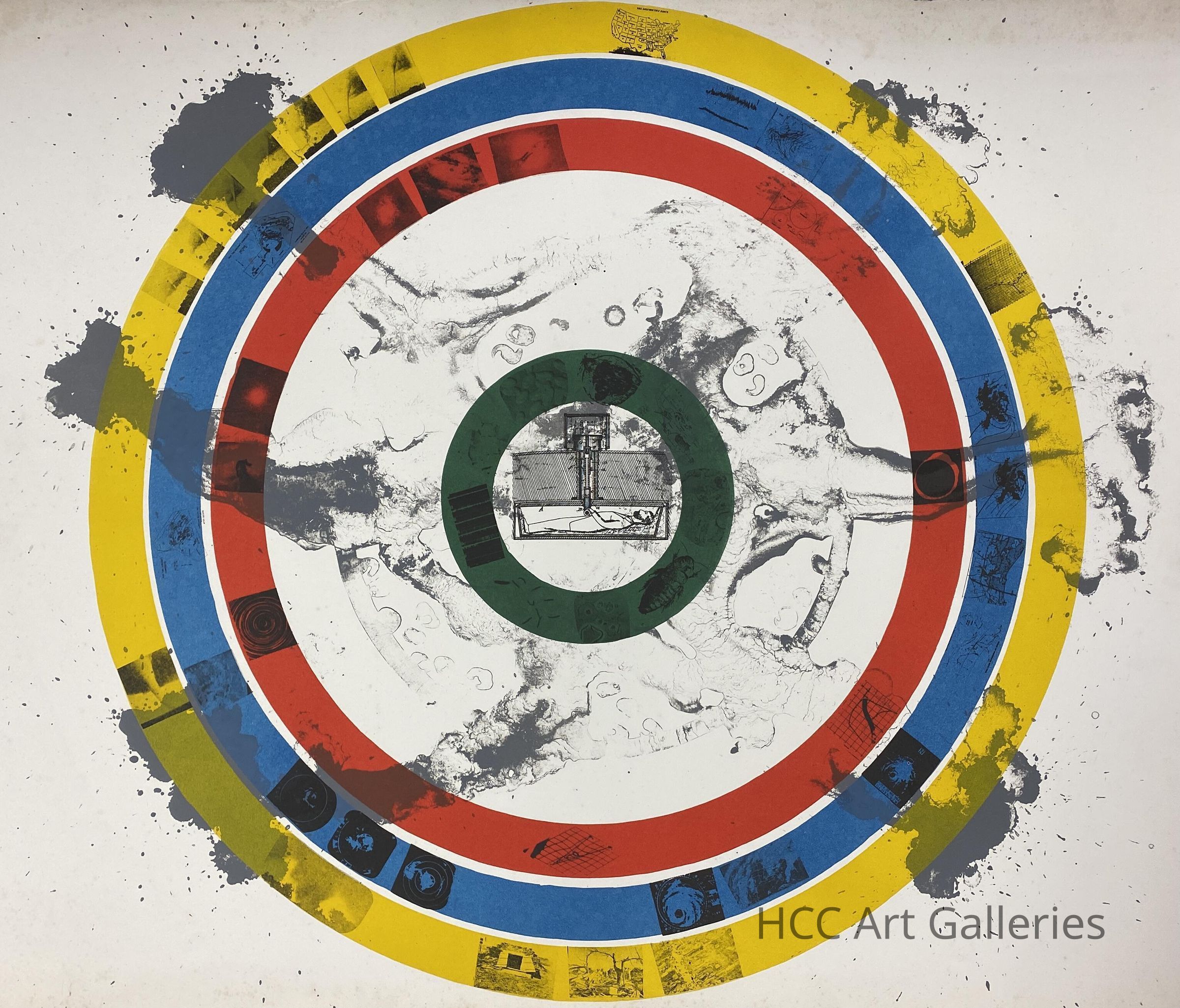 In this untitled work, Thomas Kettner overlaps concentric circles of yellow, blue, red and green on top of small illustrations of insects, hurricanes, maps, and other scientific images. The center of the composition features a small diagram of a Victorian era safety coffin, an allusion to the phobia of being buried alive. The psychological dimension of Kettner’s work invites viewers to spend additional time contemplating the veiled imagery, an active exchange that the artist wrote as being necessary for the “ultimate completion” of all his abstract work. Though Kettner spent most of his life in Tampa, he called Ybor City his home. For many years, he kept an artist studio in the historic district, embracing the Ybor City community and becoming a fixture in the arts scene.