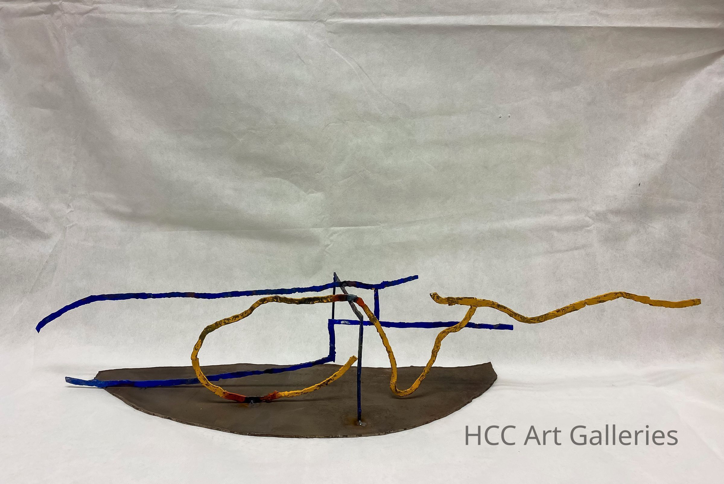 Warm Up is a maquette made in preparation for a solo exhibition at HCC in fall 2020. Using this maquette as a reference, the resulting site-specific sculpture spanned the entire width of the gallery. Labauvie’s rigid, yet lyrical lines remind the viewer of the gallery space’s own role as an instrument for artists—a vessel for play and practice as well as a tool for showcasing finished work. The exhibition, titled Warm Up: In Tandem, included prints and musical performances meant to work in concert with the sculpture. According to Labauvie: “The sound is a horizontal propagation in space; it goes straight towards its target and its target answers back. This is the tandem. The line of steel, or the line of sound: the same. They collaborate with each other between stability and movement.”