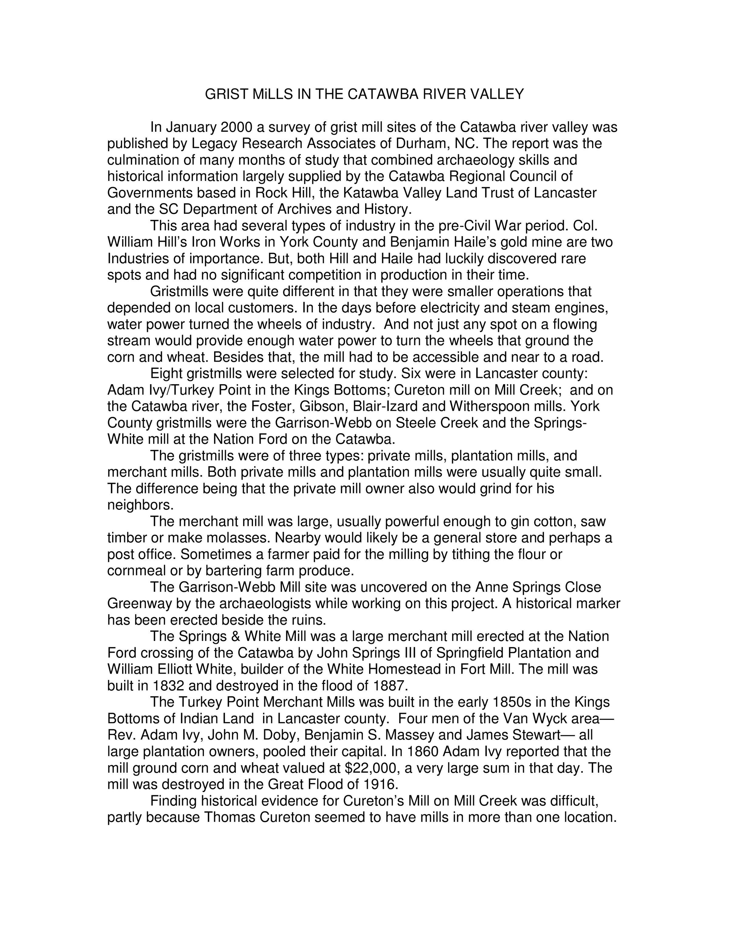 Overview Grist Mill Sites Survey of the Catawba River Valley