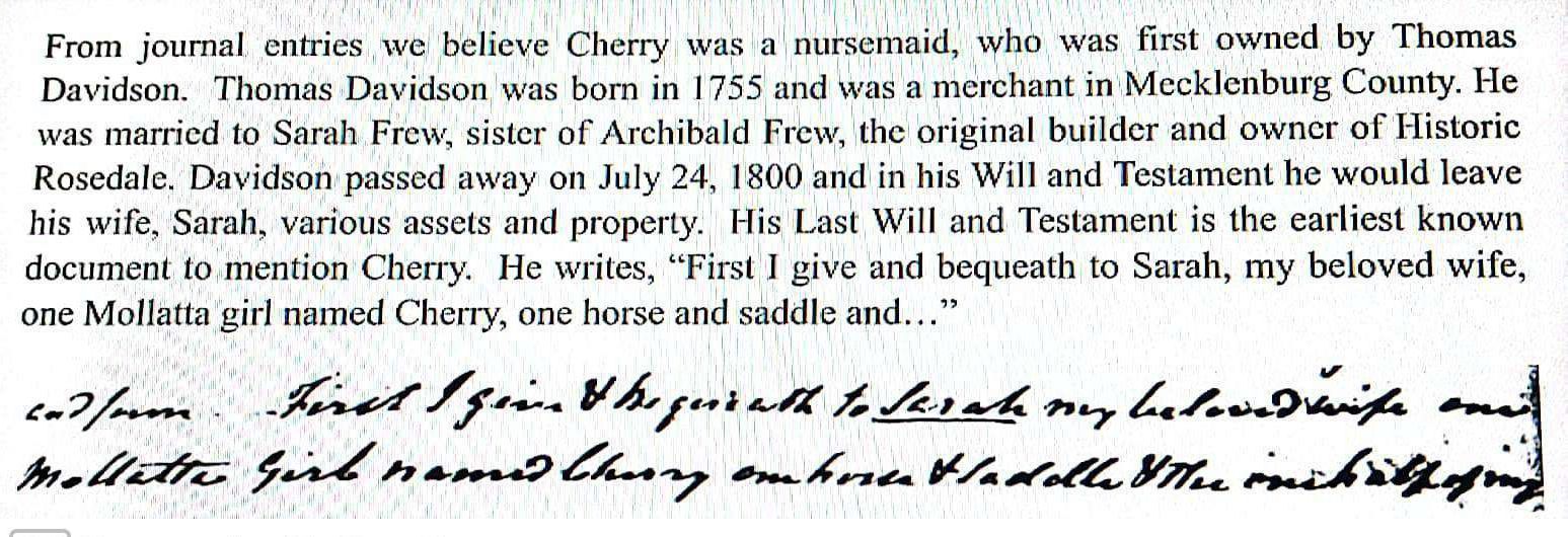 The image displays a historical document discussing Thomas Davidson's will, mentioning a girl named Cherry.