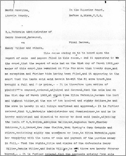 In March 1902, the court confirmed the final sale of the eighty-one-acre tract to Eliza McCorkle, and barred the claims of Henry Brevard’s nieces and nephew. In 1901 the court determined that Henry Brevard’s personal property was insufficient to cover estate debts, making the sale of land unavoidable. After Eliza’s legal right to dower was established, approximately eighty-one acres remained subject to sale. What followed was a series of court-ordered land sales between 1901 and 1902. Although Eliza repeatedly emerged as the highest bidder, her purchases were repeatedly challenged by higher post-auction bids from an outside buyer. Acting in the name of securing a “fair price,” the court set aside completed sales and ordered re-sales.