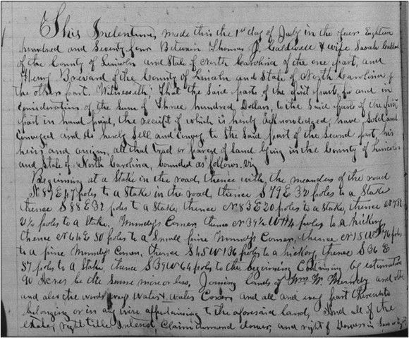One of the clearest markers of Henry Brevard’s post-emancipation success was his acquisition of land. On 3 July 1874, less than a decade after emancipation, Henry purchased approximately ninety acres from Thomas J. Caldwell for $300, receiving full fee-simple title