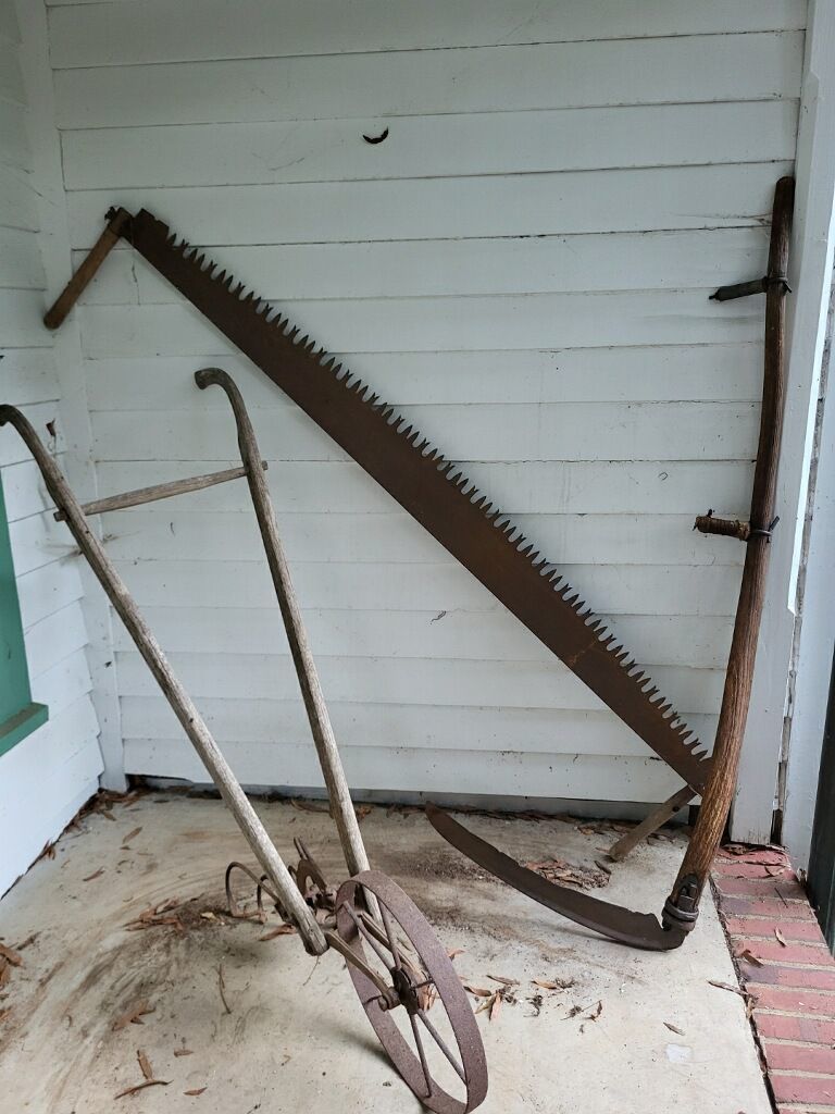 Suzanne Sadler of Davidson said these tools were used by her great grandmother. Suzanne's cousin, Jim Rhodes, the grandson of Bud and Lela Boiter of Duncan, SC said the crosscut saw and scythe date from the late 1800s. The garden plow dates from 1910 - 1920.