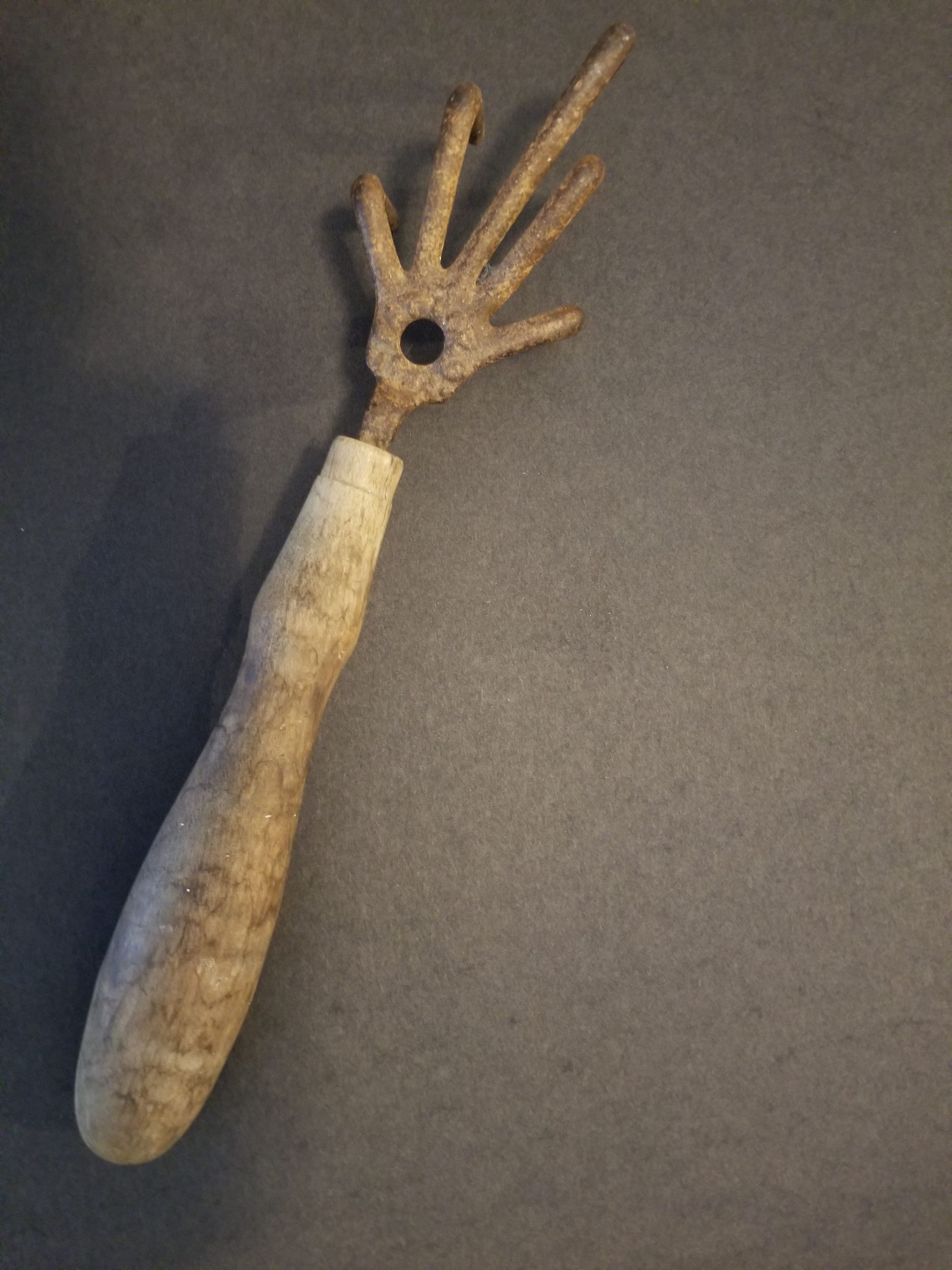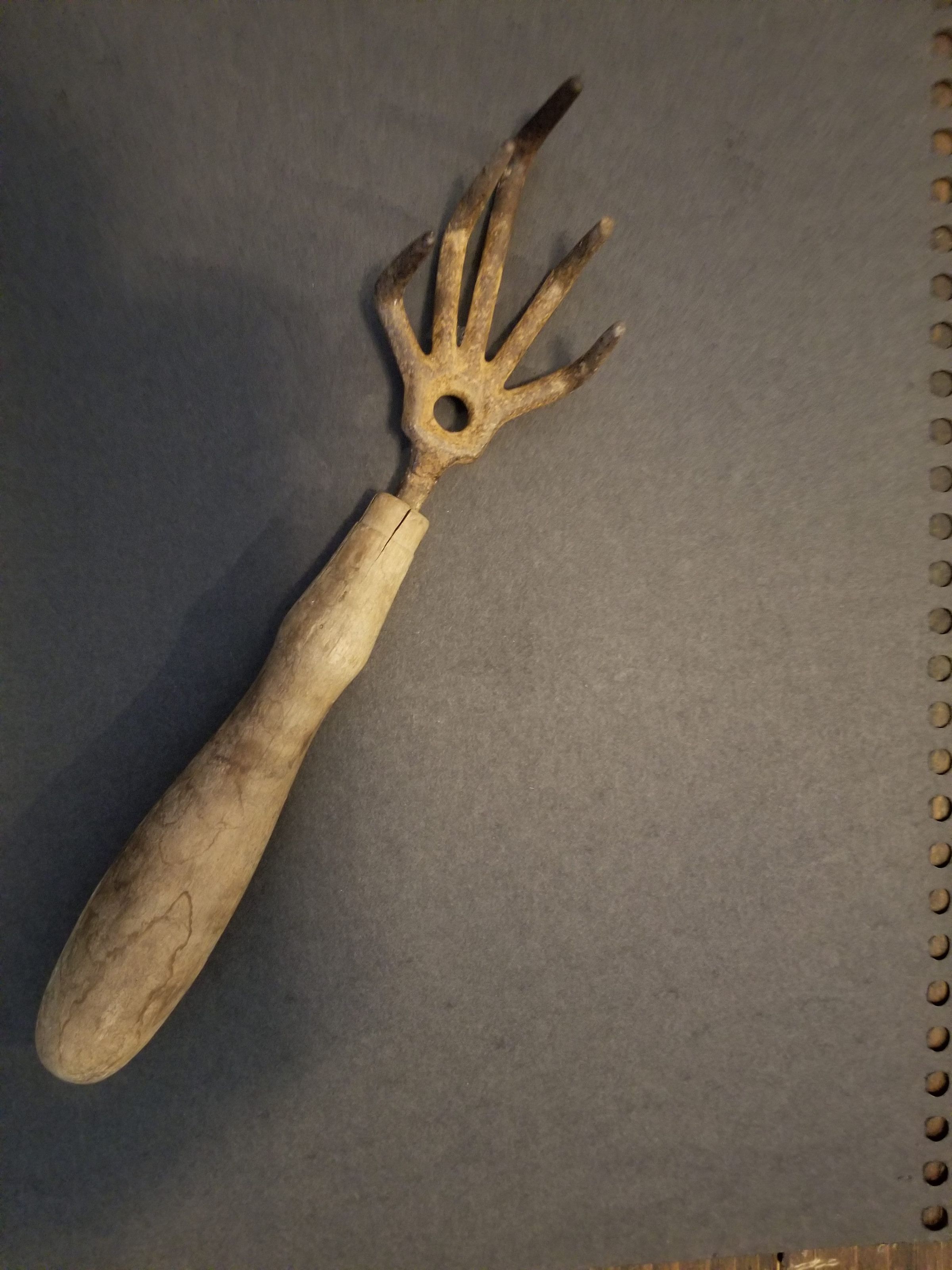 A garden hand fork/cultivator used for loosening the soil & pulling out weeds around plants, approx. 10.5 inches long, was Elizabeth Bradford's grandmother’s & her mother’s before that (circa 1800’s)