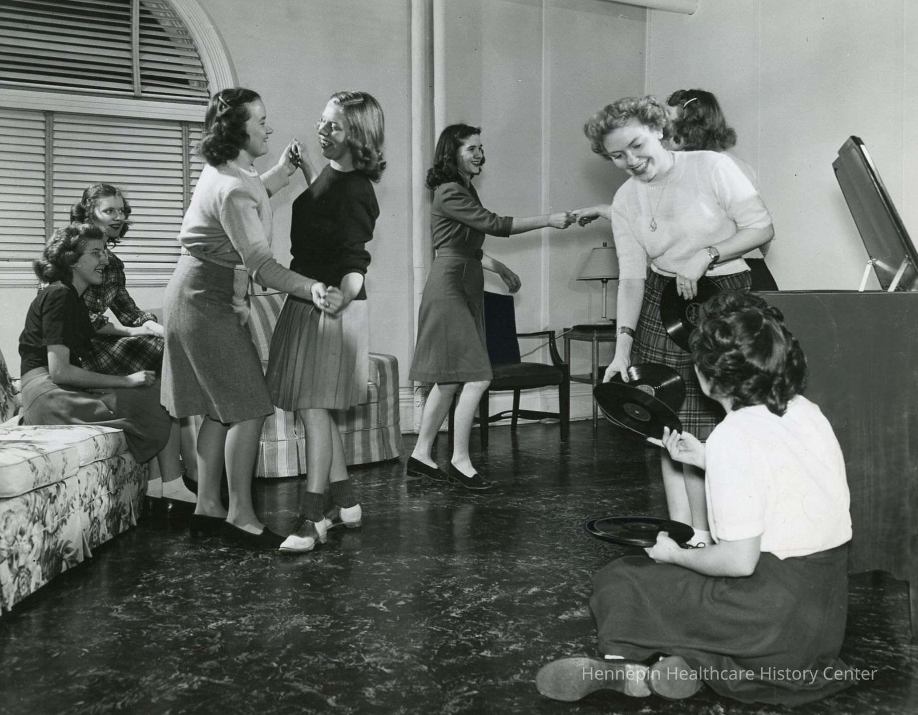 St. Barnabas Hospital School of Nursing students listened to records and danced in the lounge of the Knickerbacker Dormitory. St. Barnabas Hospital was founded as Cottage Hospital in 1870, the first hospital in Minneapolis. St. Barnabas hospital merged with The Swedish Hospital in 1971 to become Metropolitan Medical Center. That institution closed in 1991. Hennepin Healthcare now occupies the buildings.