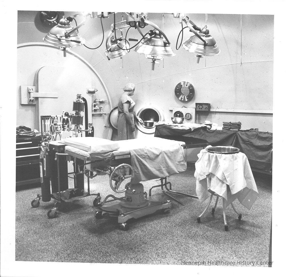 Barb Little, RN, was the first nurse to work in the first hyperbaric chamber at Hennepin Healthcare back in the 1960s. She is seen here in Chamber 3, which could hold ten people and functioned as an operating room. Formal training for hyperbaric nurses was just being established in the 1960s and certification would come later in the 1990s.