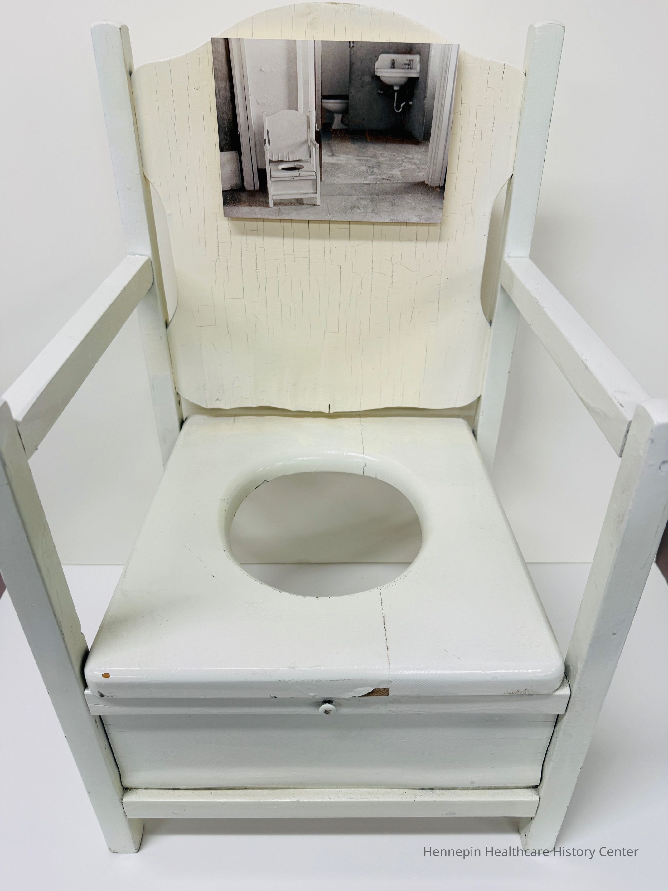 This painted wood children's potty chair was used at Minneapolis General Hospital. Image H2010.005.00660 shows the potty chair when in the hospital next to a bathroom with toilet and sink.