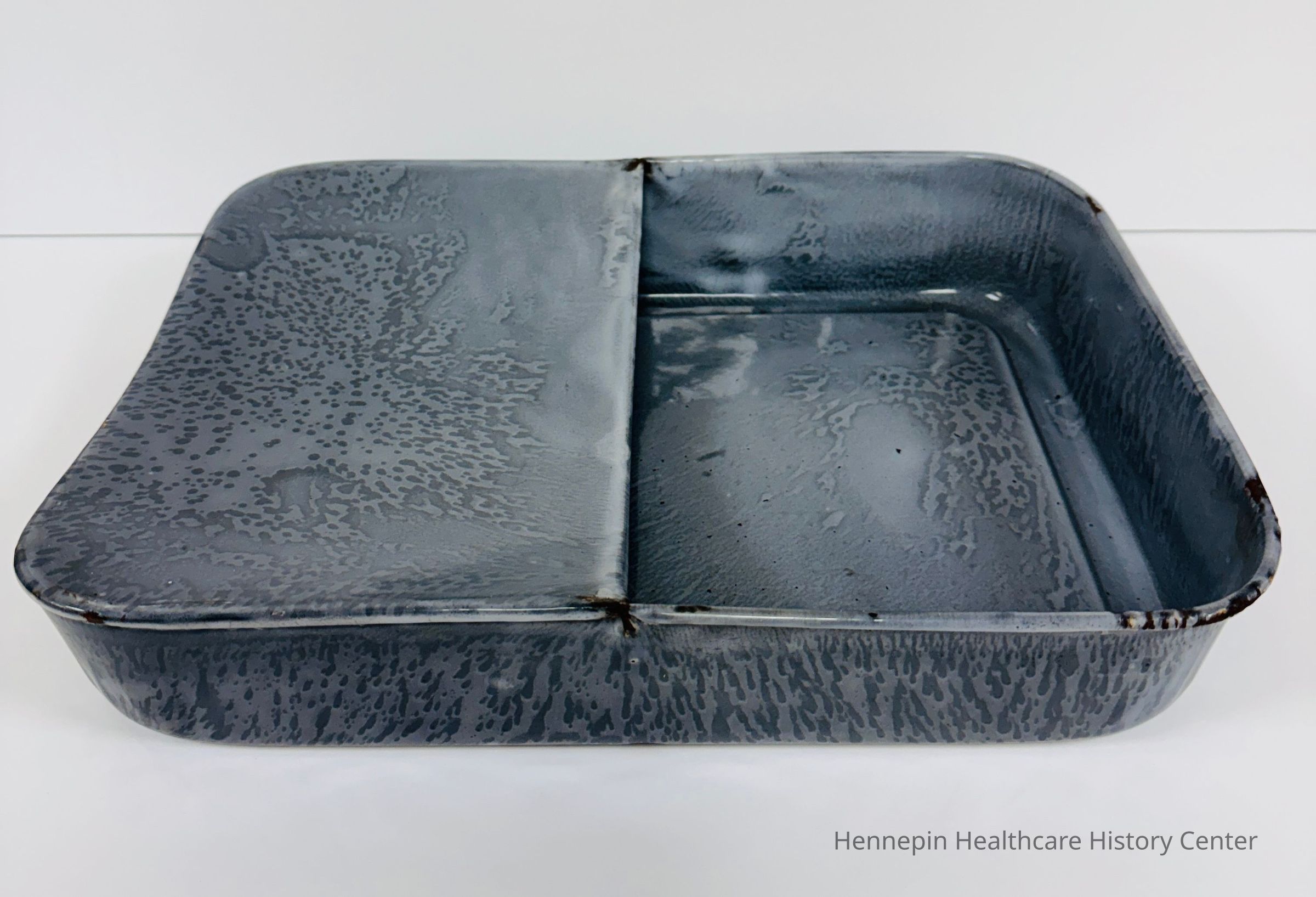 This gray enameled metal bedpan from the 1880s was originally used at the Fergus Falls Park Region Hospital in Minnesota. It was donated to the collection by a 1941 St. Barnabas Hospital School of Nursing graduate. Though enamelware was more expensive, it had a longer life and was lighter and more durable than ceramic.