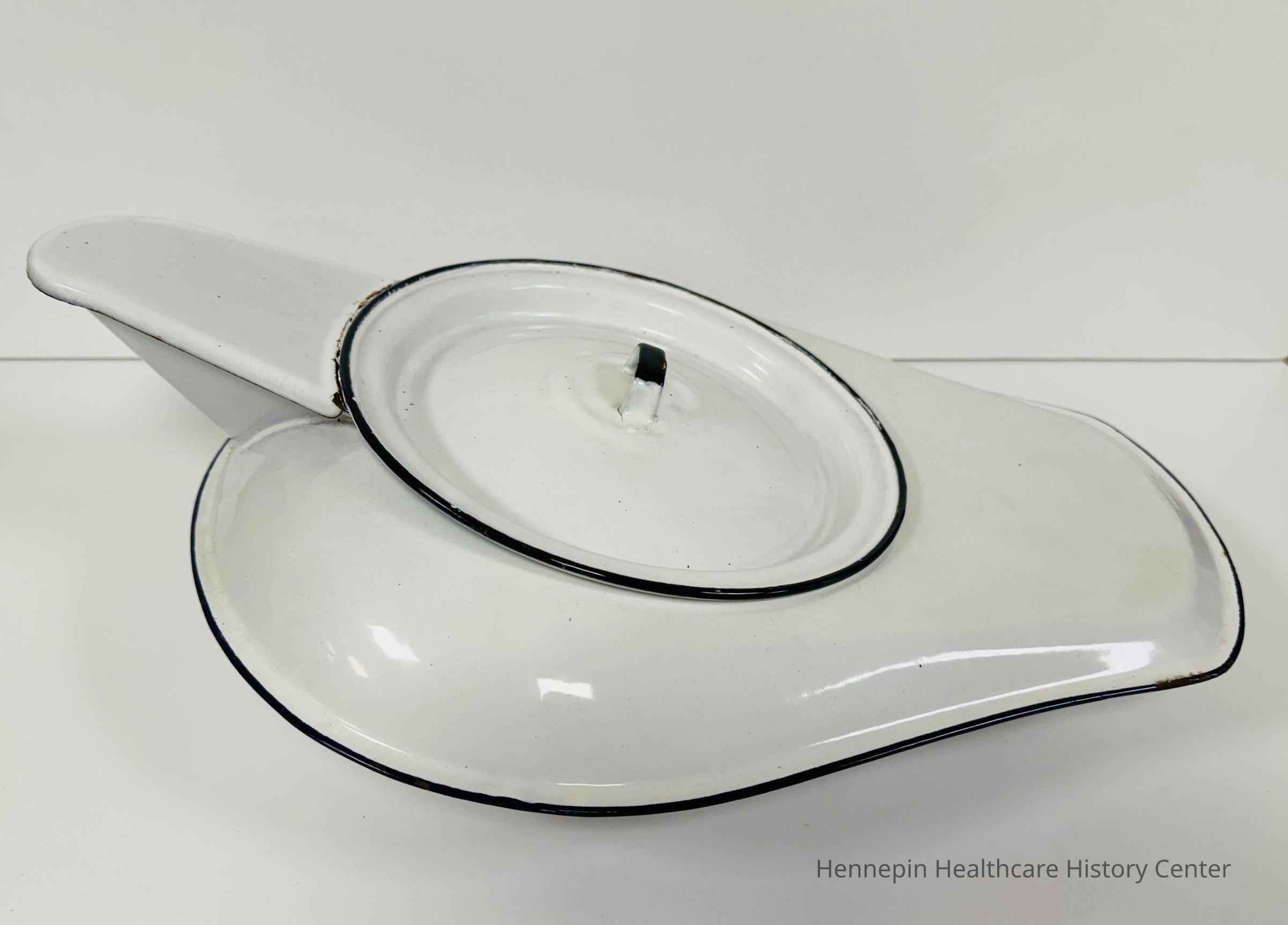 This enameled metal bedpan with cover was made around 1910. Its unique design allowed it to be used as a bedpan or a urinal.