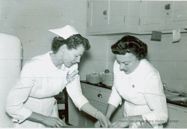 Nurses Mrs. Arlys Boodnow, Men's Medicine Supervisor, and Virginia Schmidt, Assistant Supervisor Women's Medicine, take a moment in the Minneapolis General Hospital break room in 1940. The daily average of nurses on duty in 1940 was one hundred-thirty R.N.s and two hundred five students. A one month annual vacation with pay was recommended for R.N.s