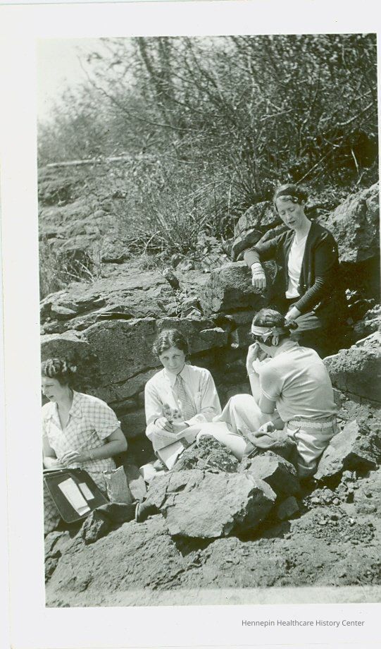 Minneapolis General Hospital nursing instructors gather on the shores of Lake Superior in 1934. In the photograph is Doris Miller, Assistant Superintendent of Nursing, Myrtle Hodgkins, Clinical Instructor of Medical Nursing, and Ruth Johnson, Clinical Instructor of Communicable Diseases, as well as an unidentified woman. The photograph is stamped by the NRA Pake Photo Services with an inscription that says, "We Do Our Part". It was likely created by the National Recovery Administration, founded in 1933 by Franklin D. Roosevelt.