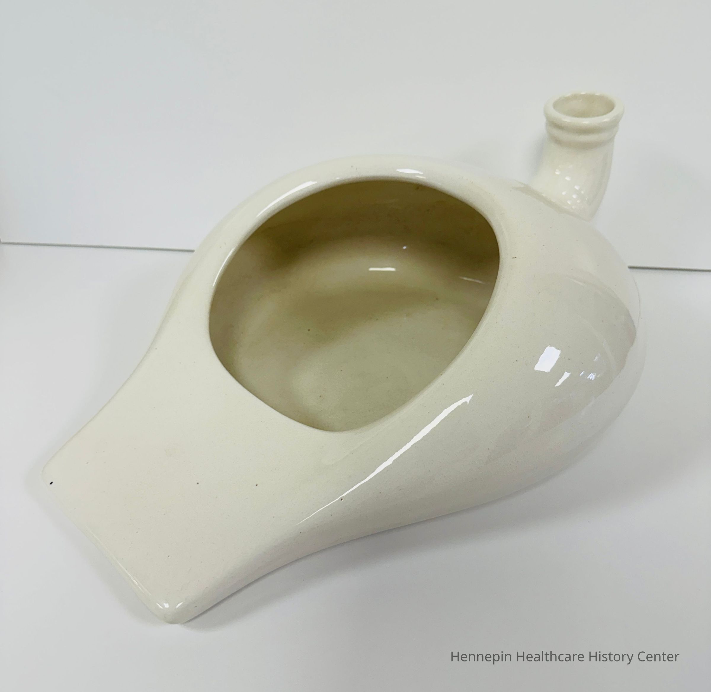 This ceramic bedpan/urinal combo dates to the late 1800s-early 1900s. The bottom front is flat and tapers upward for ease of use. This tapered shape is especially important for fracture care patients. This particular bedpan also has a male urinal attachment that is shaped a bit like a plumbing pipe.
