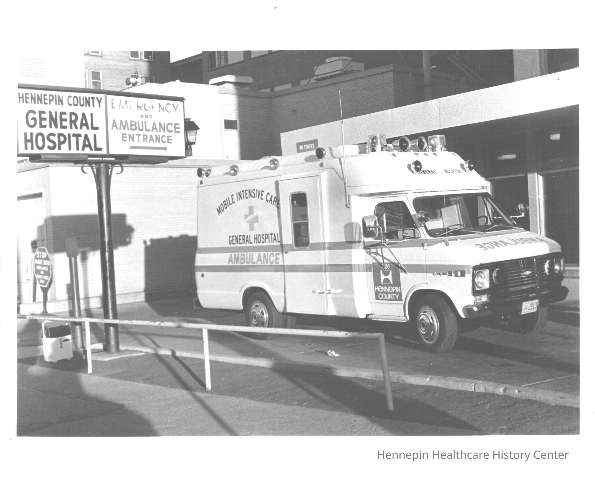 Black and white photograph of a Hennepin County General Hospital ambulance outside of the Emergency and Ambulance Entrance. Minneapolis General Hospital ownership went from the city to the county in 1964, prompting the name change. The hospital was renamed once again to Hennepin County Medical Center (HCMC) in 1974. The HCMC campus is now part of the Hennepin Healthcare system.