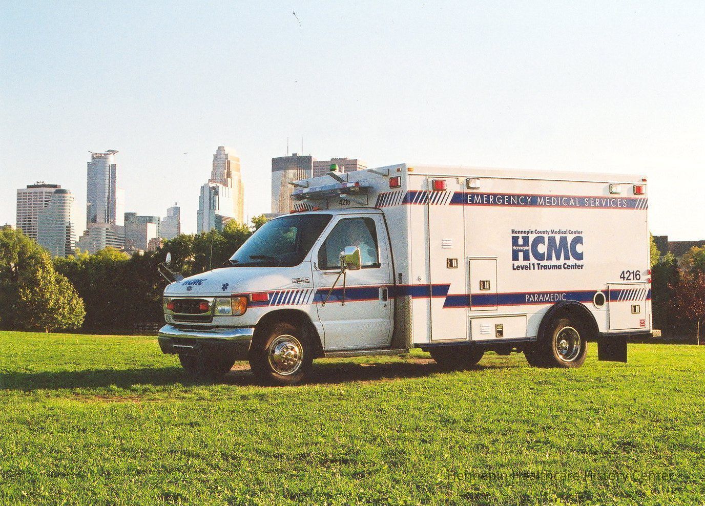 Color photograph of a Hennepin County Medical Center Ford ambulance from around the 1990s. Printed on the side of the ambulance is "Emergency Medical Services/Hennepin County Medical Center/HCMC/Level 1 Trauma Center/Paramedic." Part of downtown Minneapolis is seen in the background.