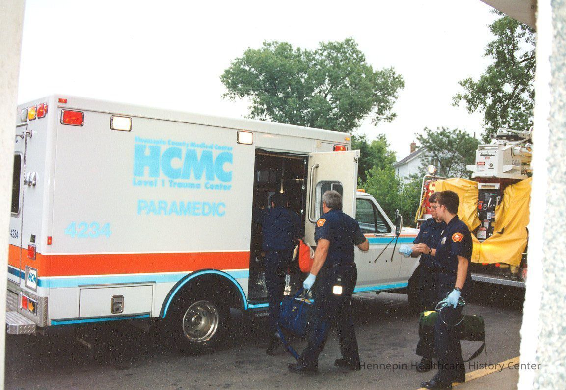 Color photograph from the 1990s of a Hennepin County Medical Center ambulance. Printed on the side of the ambulance is "Hennepin County Medical Center/HCMC/Level 1 Trauma Center/ Paramedic."