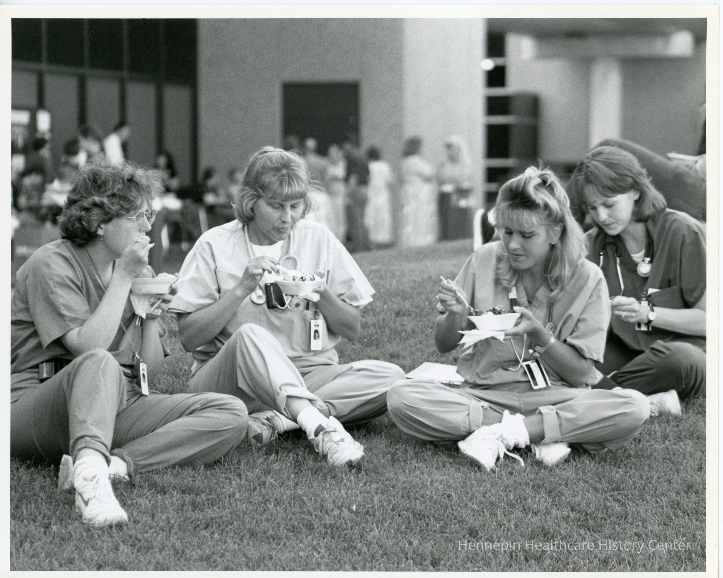 Four nurses sit on the lawn of the HCMC campus eating ice cream during an ice cream social in 1996.
