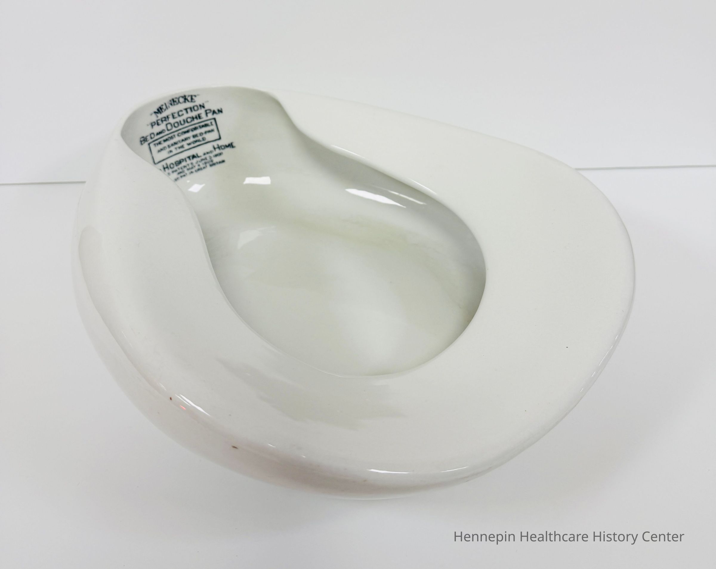 This ceramic bedpan dates from the early 1900s. The inner lip is imprinted with the following text: "Meinecke Perfection Bed and Douche Pan; The Most Comfortable Sanitary Bed-Pan in the World; For Hospital and Home." Meinecke also patented their bedpan design.