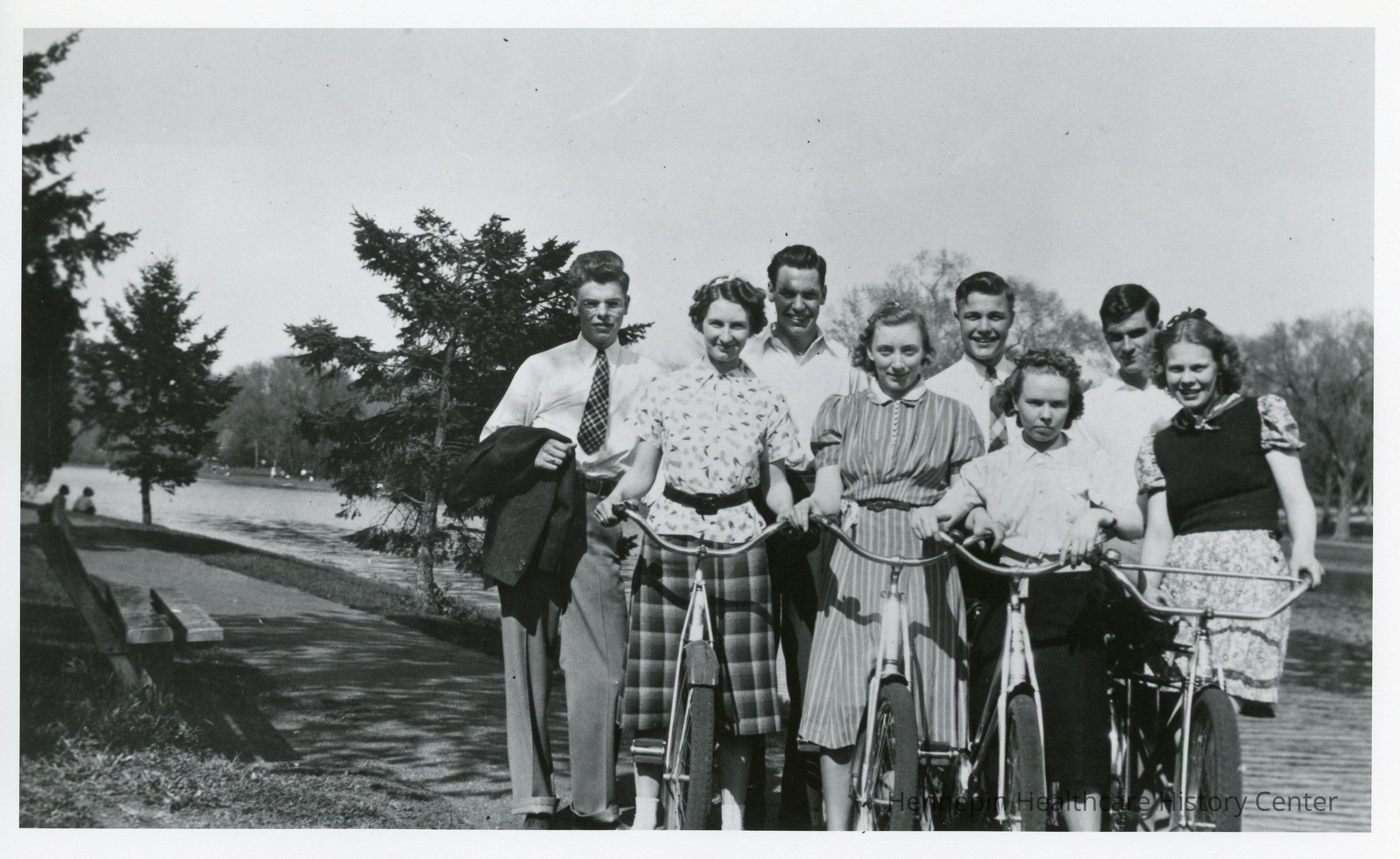 Four students from The Swedish Hospital School of Nursing enjoyed a day of bicycling at Lake Calhoun (now known as Bde Maka Ska) in 1940. Along the way, they met some new friends. The Swedish Hospital merged with St. Barnabas hospital in 1971 to become Metropolitan Medical Center. That institution closed in 1991. Hennepin Healthcare now occupies the buildings.