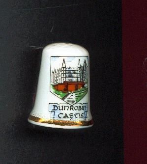 White glazed bone china Souvenir thimble, slightly fluted with gold band near rim. Colured Decal of castle with ÒDunrobin Castle in black print below.No marks inside.