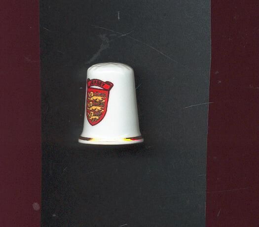 White glazed china Souvenir thimble, fluted with narrow gold band at rim. Red and gold crest with ÒJerseyÓ on banner at top. Stamped inside ÒTP Theodore Paul Fine English Bone ChinaÓ