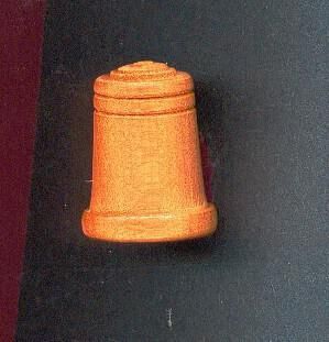 Wooden thimble with raised rim. Incised lines, 2, near top. Top has circular incised lines around. Inside around base , printed in black is New Zealand Kauri.