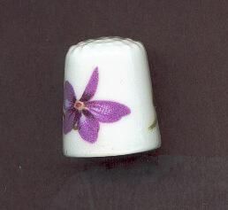 Squat shaped china thimble, white, no rim. Screen printed violet and stem one side, large violet leaf other side. No marks.