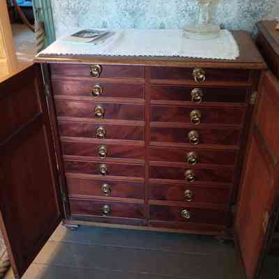 Mahogany cabinet with 16 drawers. Used for thimble collection.