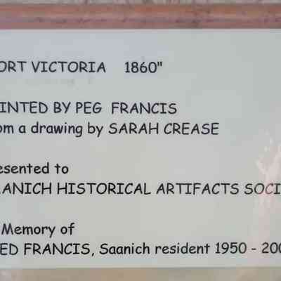 Framed oil painting of Fort Victoria in 1860 by Peg Francis from a drawing by Sarah Crease.