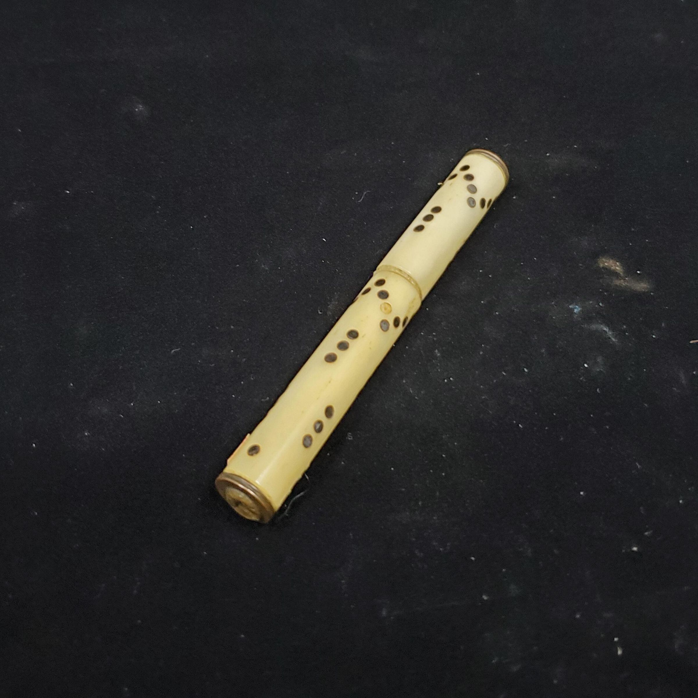 Ivory needle case, long, tubular type with brass ends.Decorated with circular marcasite pieces. Called Pique decoration. Each end has a raised something on it. Pull off topNote- are these marcasite or an inlay of small silver dots, or pose which was an inlay using sheet silver or gold?