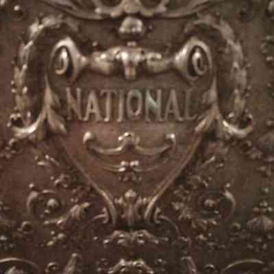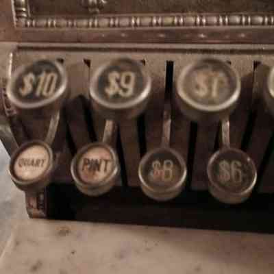 National brand cash register made of nickel plated cast metal in an ornate design. It has a marble cash shelf. Price indicators are covered with glass. Base and cash tray is made of wood. 33 keys include Quart, 1/2 Pint, and Pint.