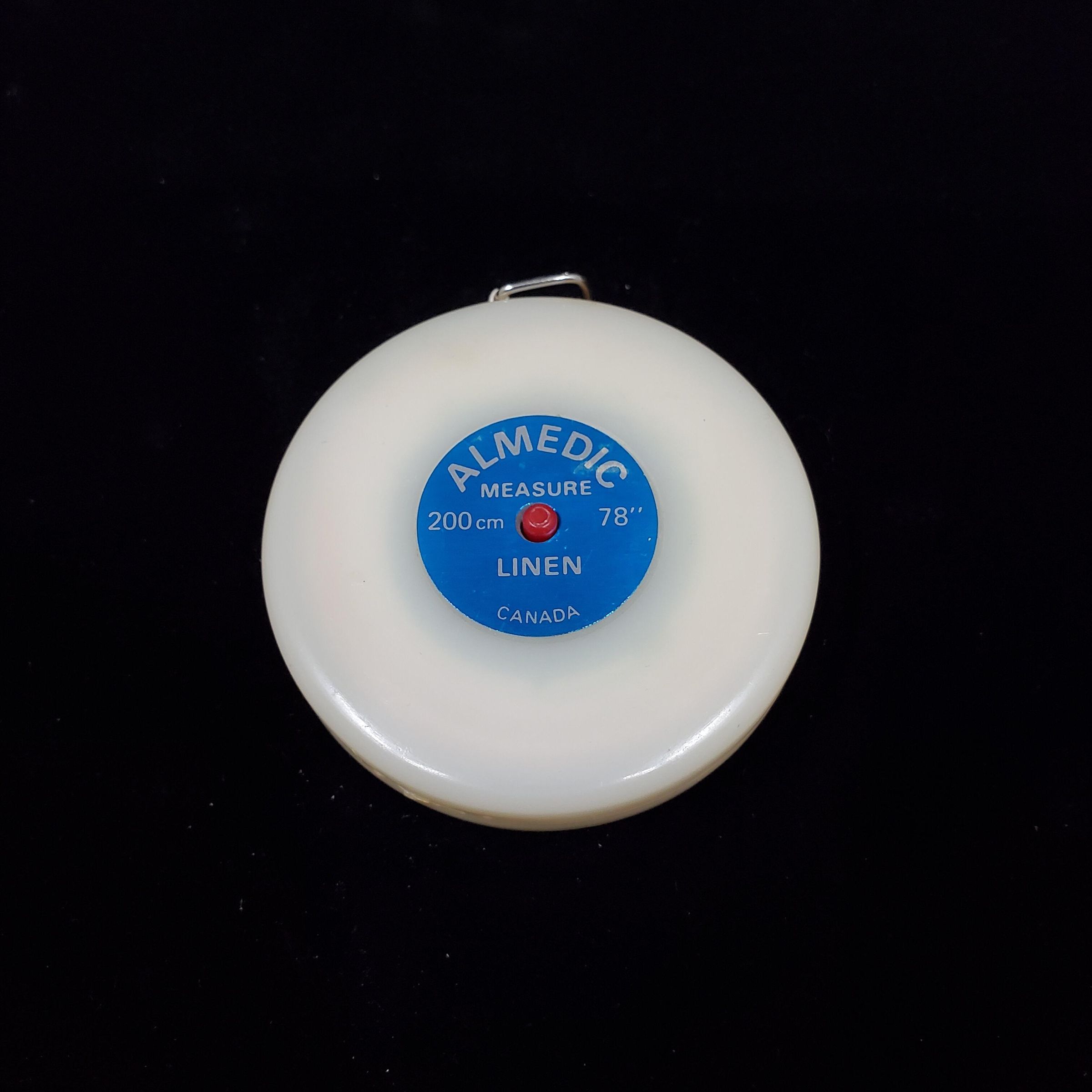 Round Advertising tape measure. Case is a creamy white plastic. Top has blue disc in center with ÒAlmedic Measure 200cm 78Ó Linen CanadaÓ printed in silv er on it. Tape pink with metal end. Spring mechanism.