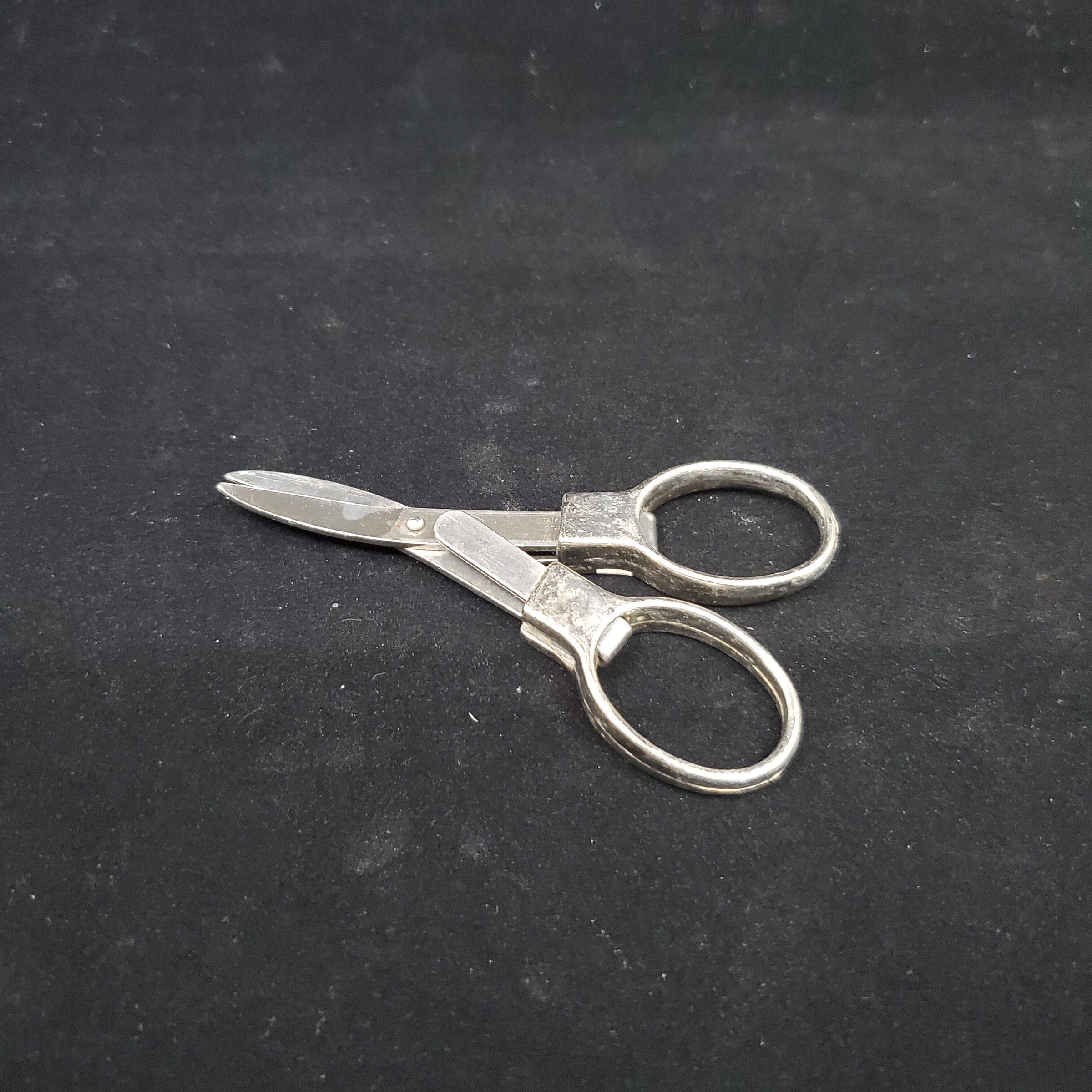 Folding scissors. Steel blades. Handles steel coloured but do not react to magnet - maybe nickel? No marks.
