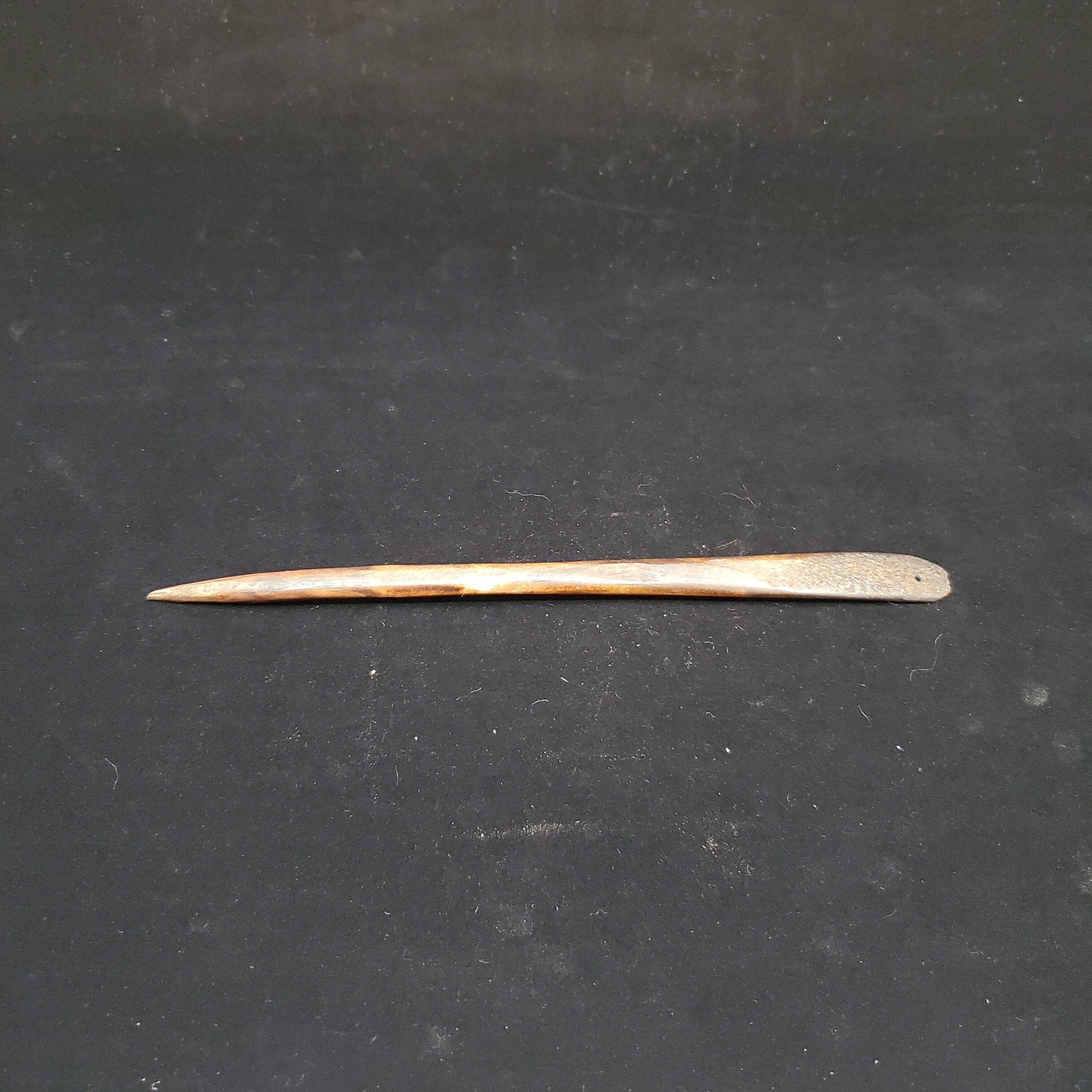 African bone needles. 2 lengths with hole near top in each. Dark to medium brown colours. One end pointed. Holes in each are regular as though made by machine or other implement.