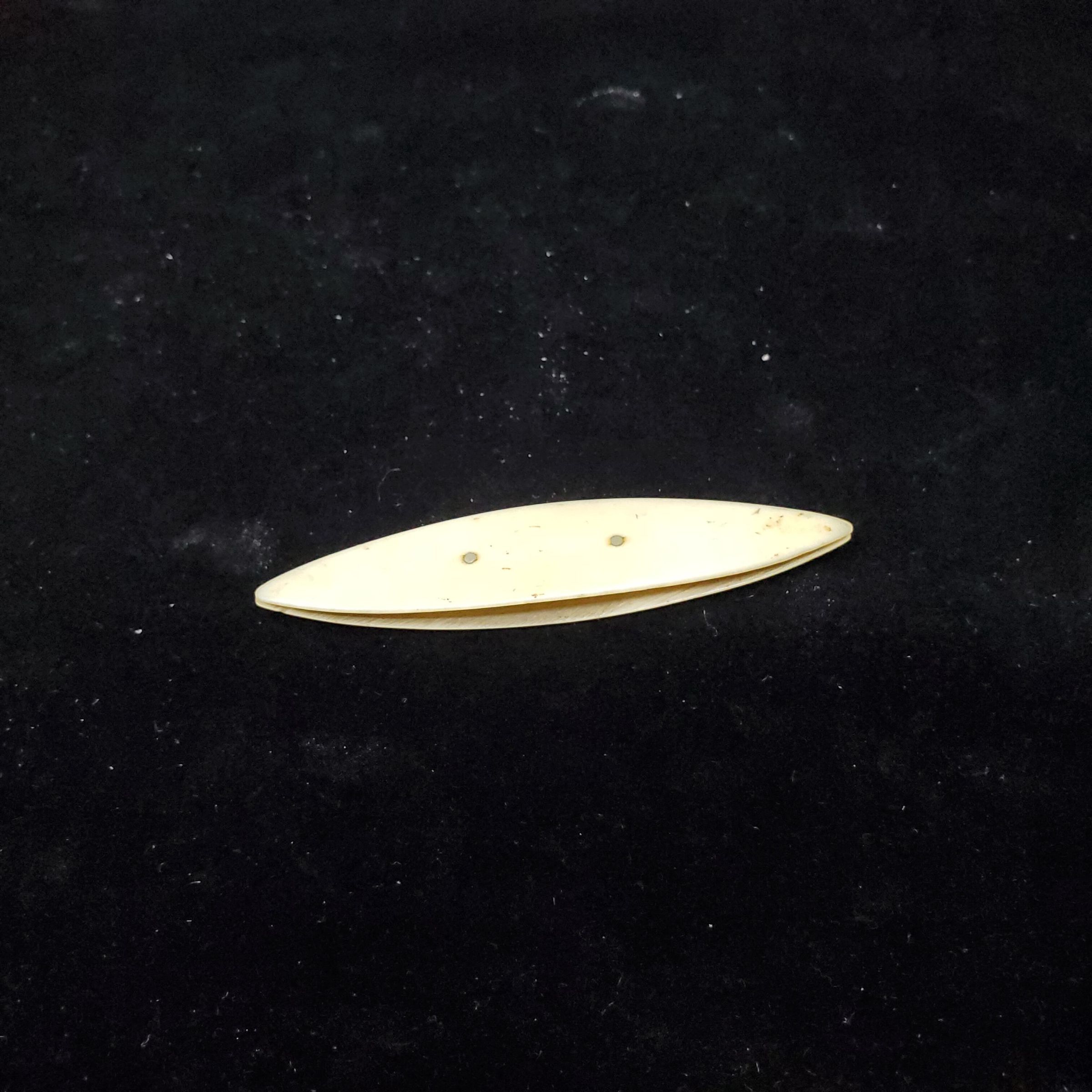 Bone tatting shuttle with rivetted center post. Ends touch nicely.Center post intact. Off white colour with light brown bone markings.