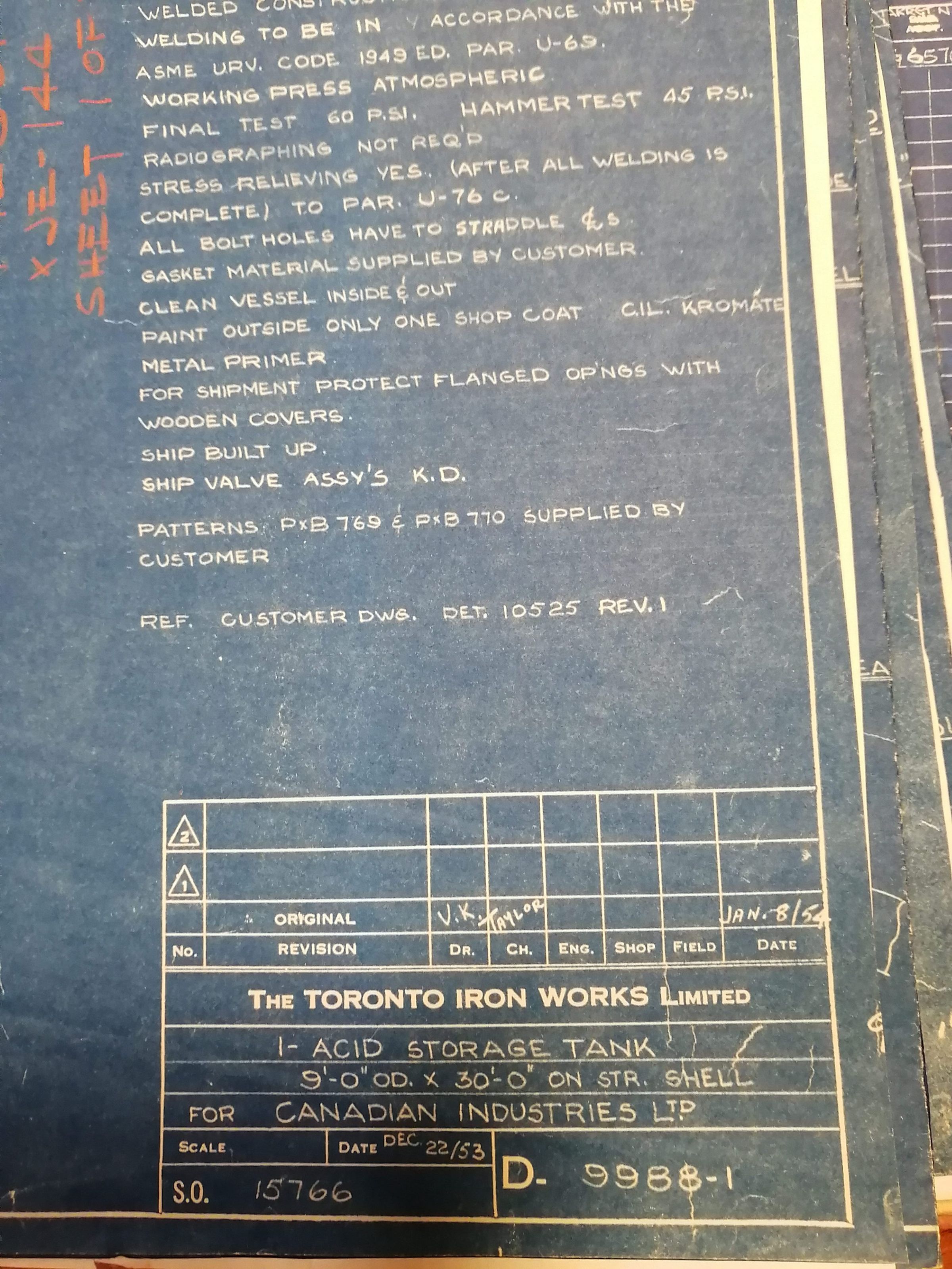 Acid storage tank. The Toronto Iron Works. Technical drawing.