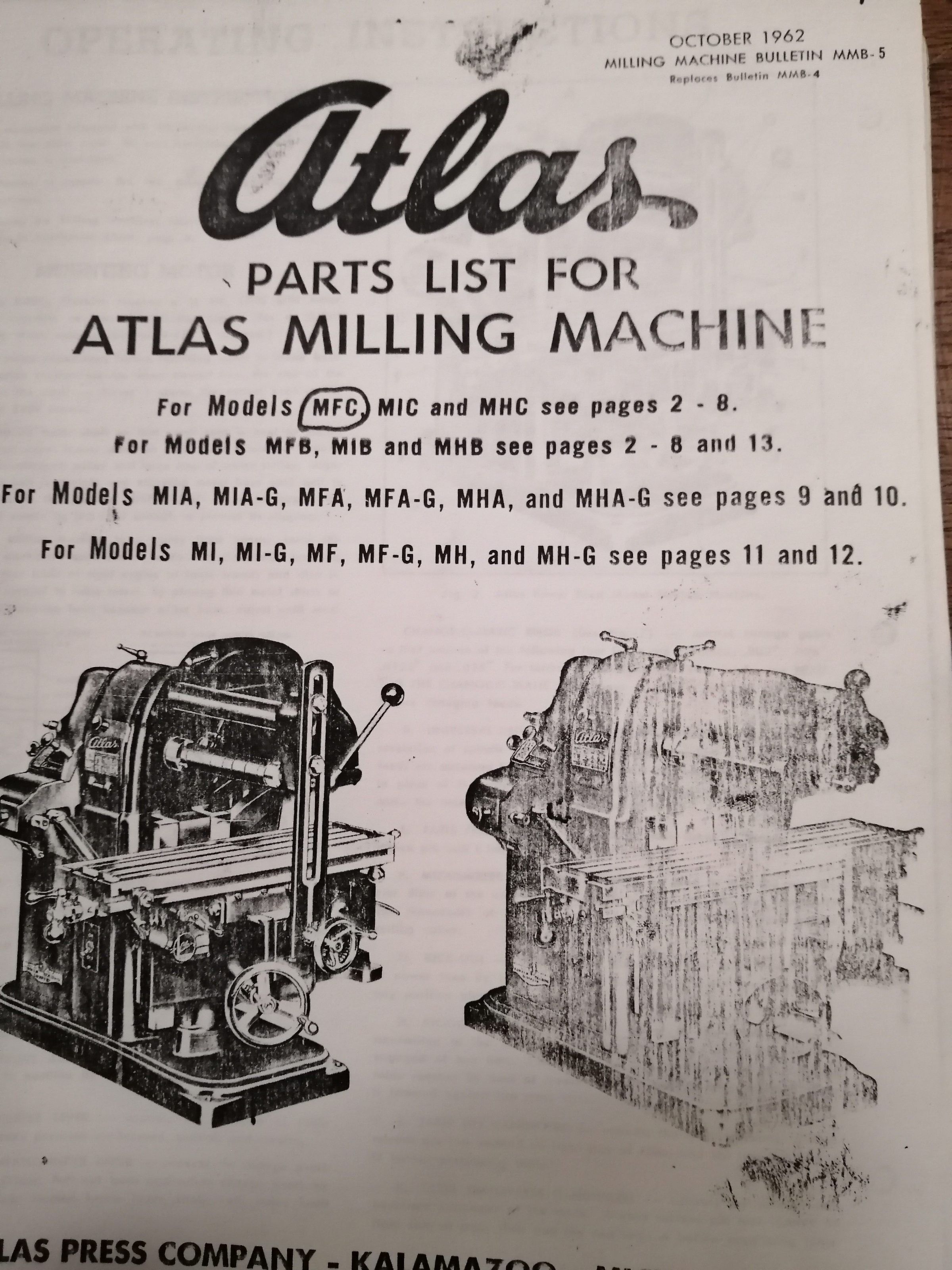 Atlas parts list for Atlas milling machine