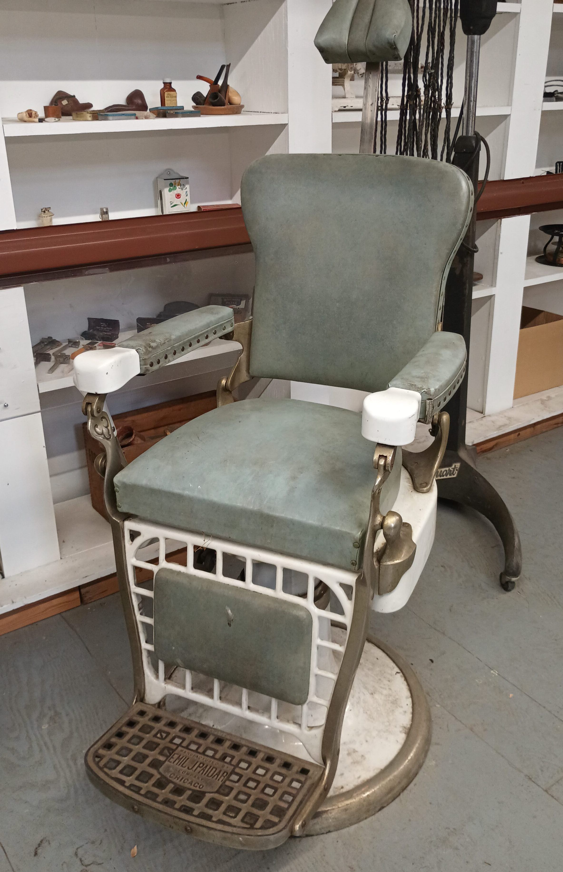 Emil J Paidar barber's chair upholstered pale green leather with headrest and footrest.