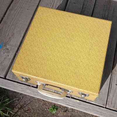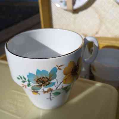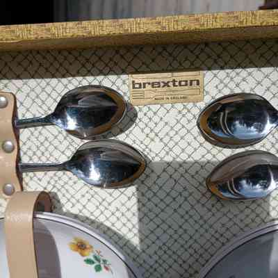 Set of four china tea cups and saucers with spoons and three plastic containers for food in a suitcase. Manufactured by Brexton, England.circa 1950's 1960's
