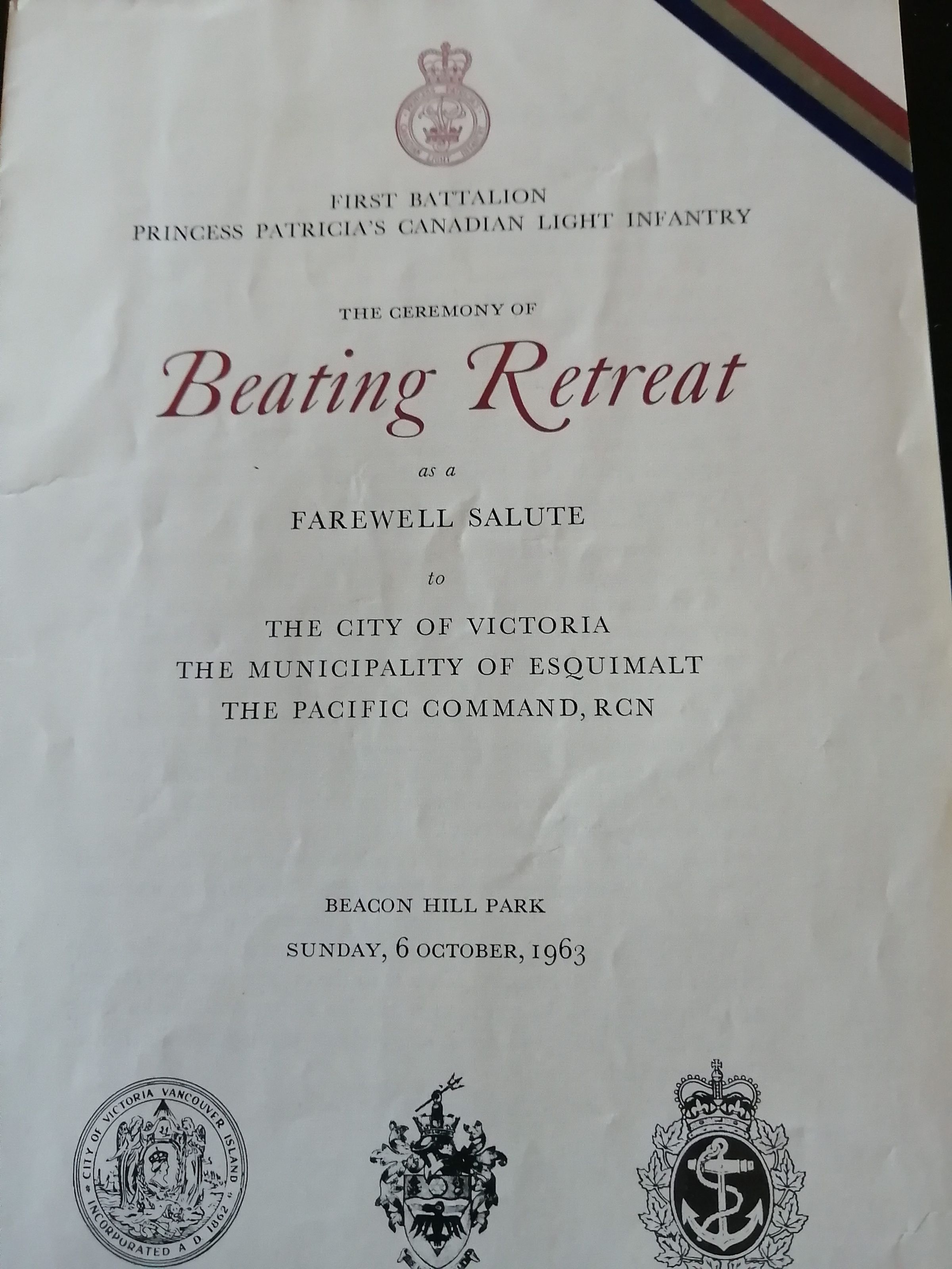 Beating retreat. First battalion Princess Patricia's Canadian Light Infantry. The ceremony of Beating Retreat at a farewell salute to the city of Victoria, the Municipality of Esquimalt, The Pacific Command, RCN