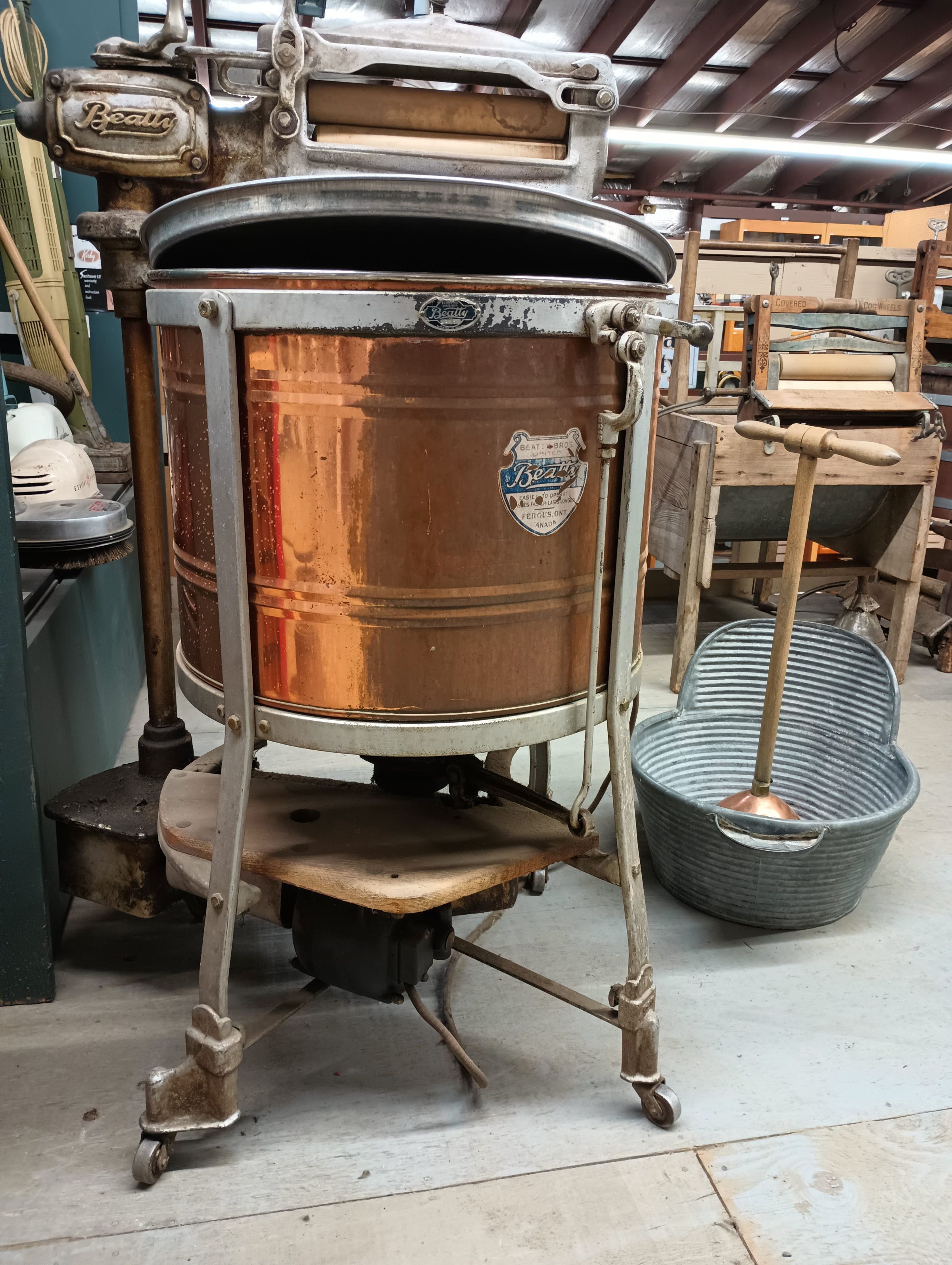 Manufactured by Beatty Brothers, Fergus Ontario, founded in 1874 by brothers George and Matthew Beatty. "The company reached its technological peak in 1927, when it pioneered the use of the agitator in the design of washing machines, which spun clothes around a tub in circular fashion, preventing them from getting clumped or tangled.[12] The Beatty electric washing machine was the bridge between two realities for the Beatty company: a rurally-based manufacturer of agricultural equipment which also produced sleek, modern appliances suited to the 20th century domestic household.[13] The electric washing machine's technology was the culmination of years of refinement of water pump and washing machine technology which originated with utilitarian farm machinery, but which now, branded and given an attractive design, could be marketed to ordinary consumers." https://en.wikipedia.org/wiki/Beatty_Brothers_Limited