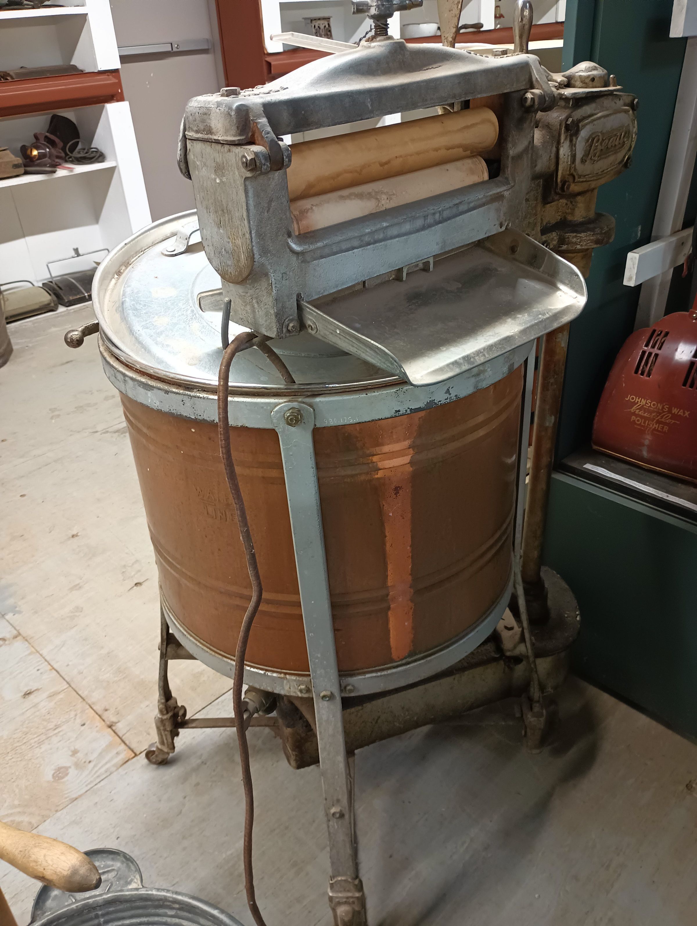 Electric wringer washer with copper tub on four casters. It has a lid, roller bars and agitator.Context