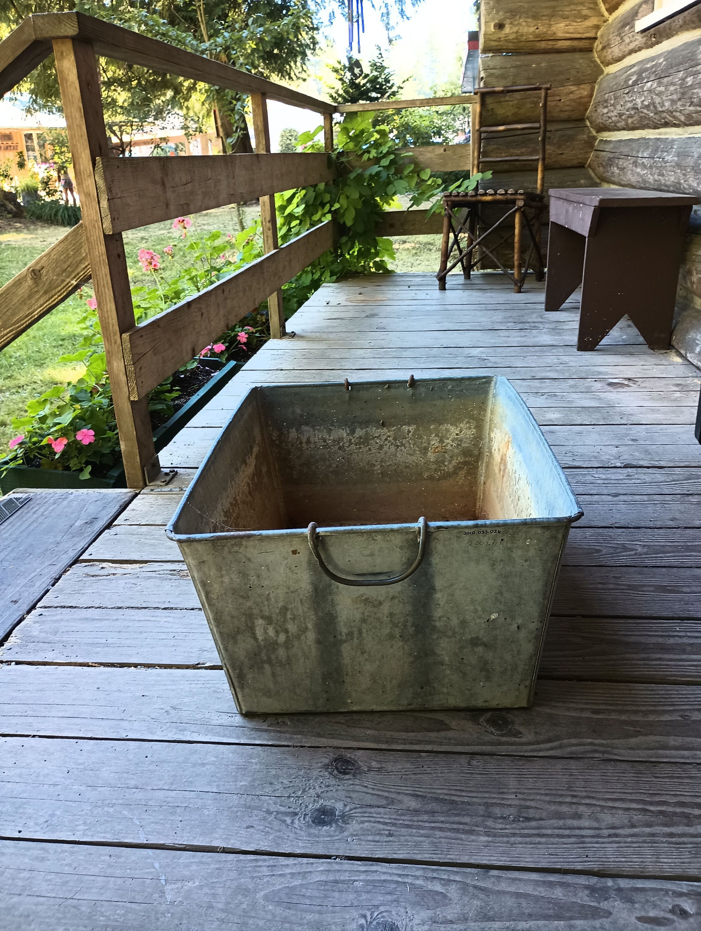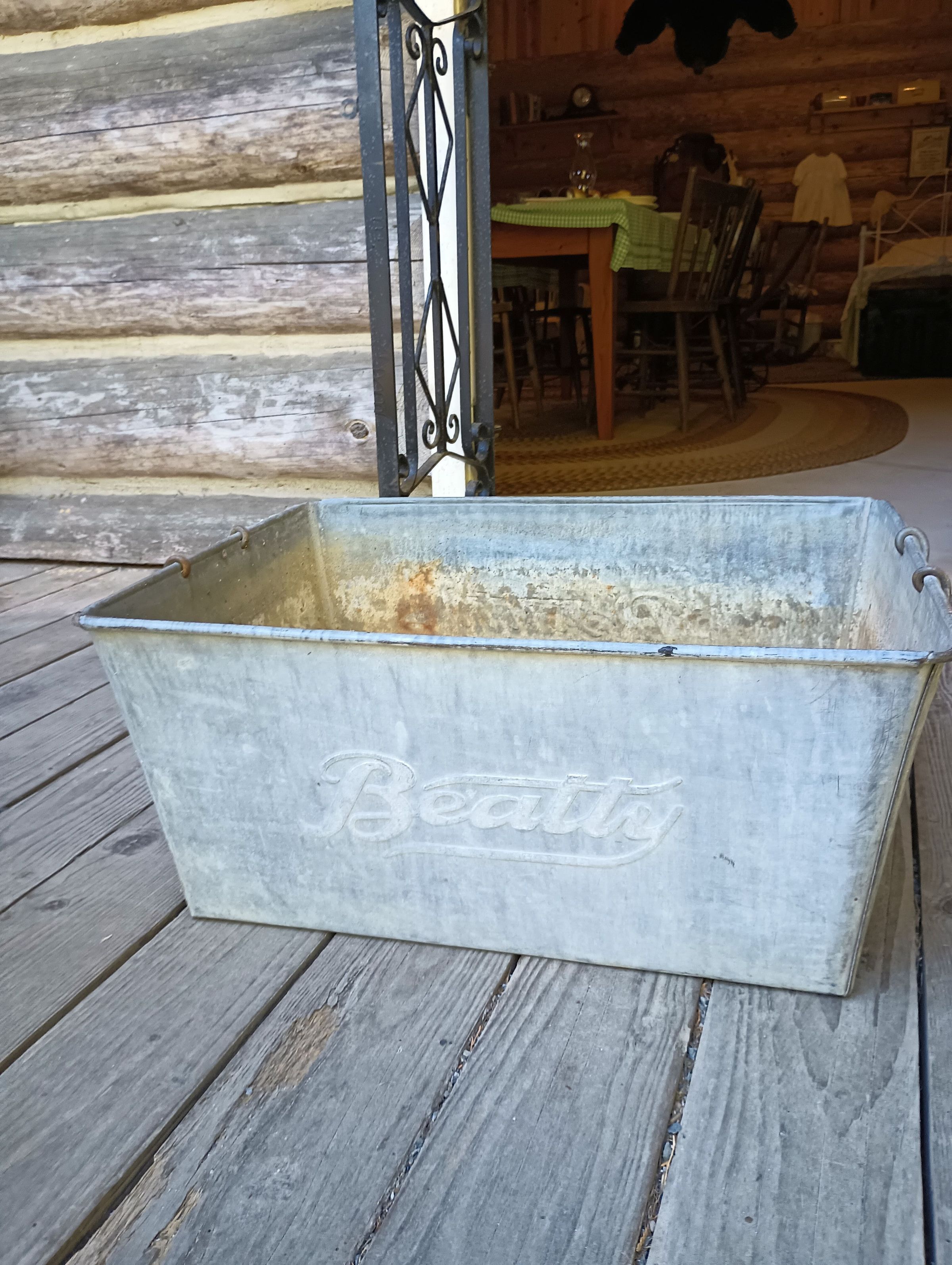Rectangular galvanized metal washtub with handles. Manufactured by Beatty Brothers Ltd.