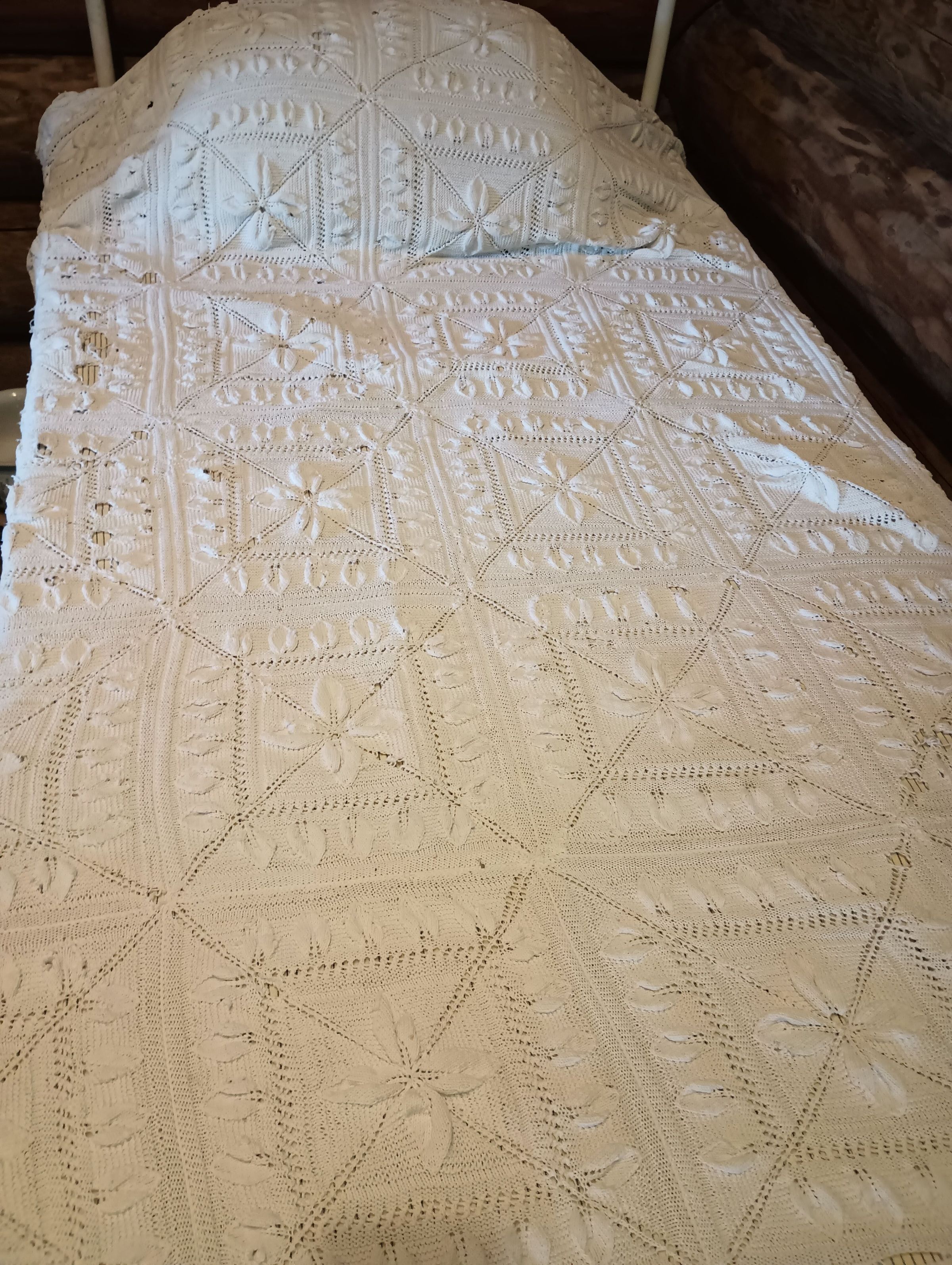 Hand knit cream coloured bedspread.