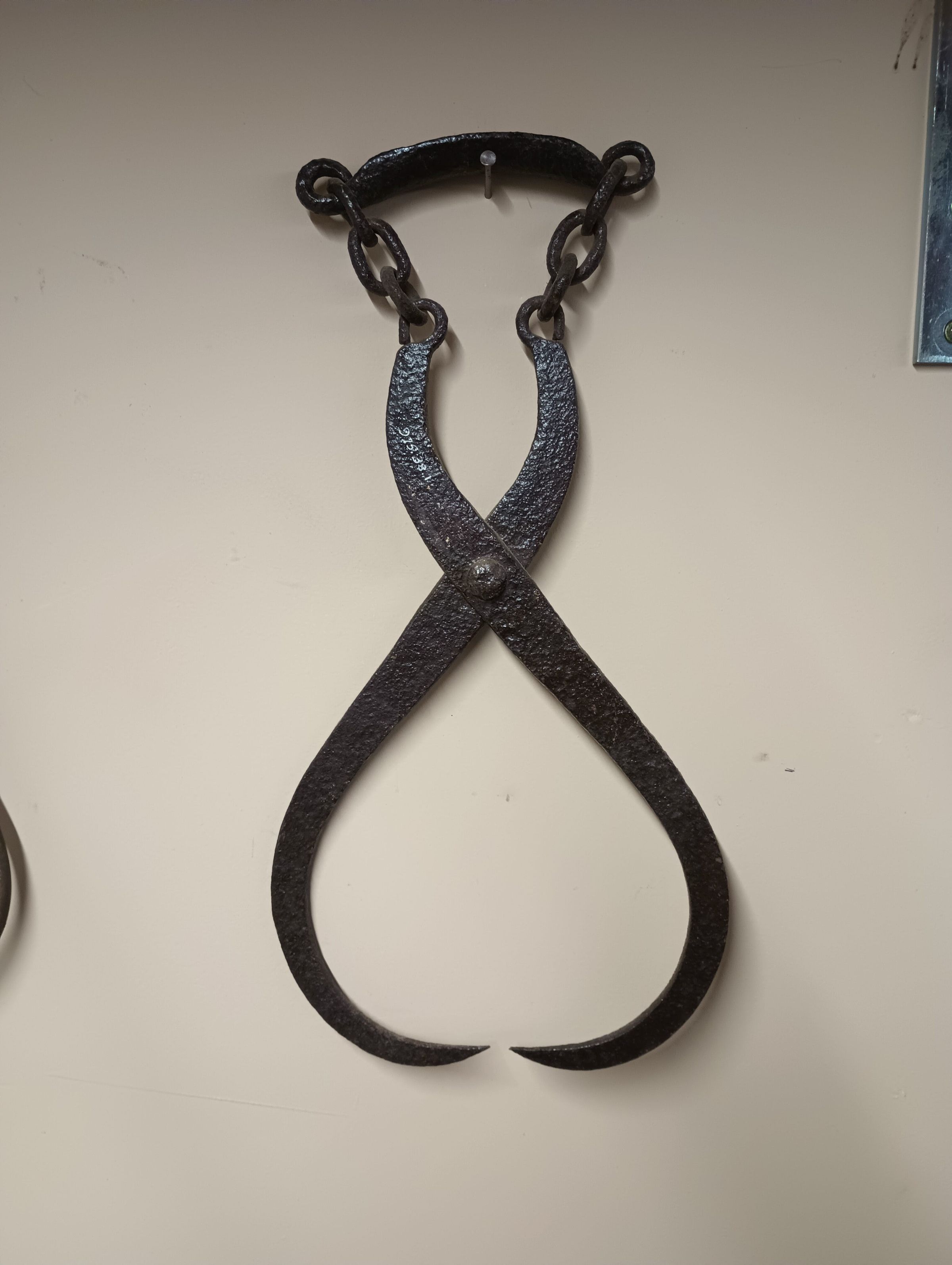 Metal tongs with single handle attached by chains. Used to pick up and carry large blocks of ice. Before electric refrigeration, workers made household deliveries of block ice.