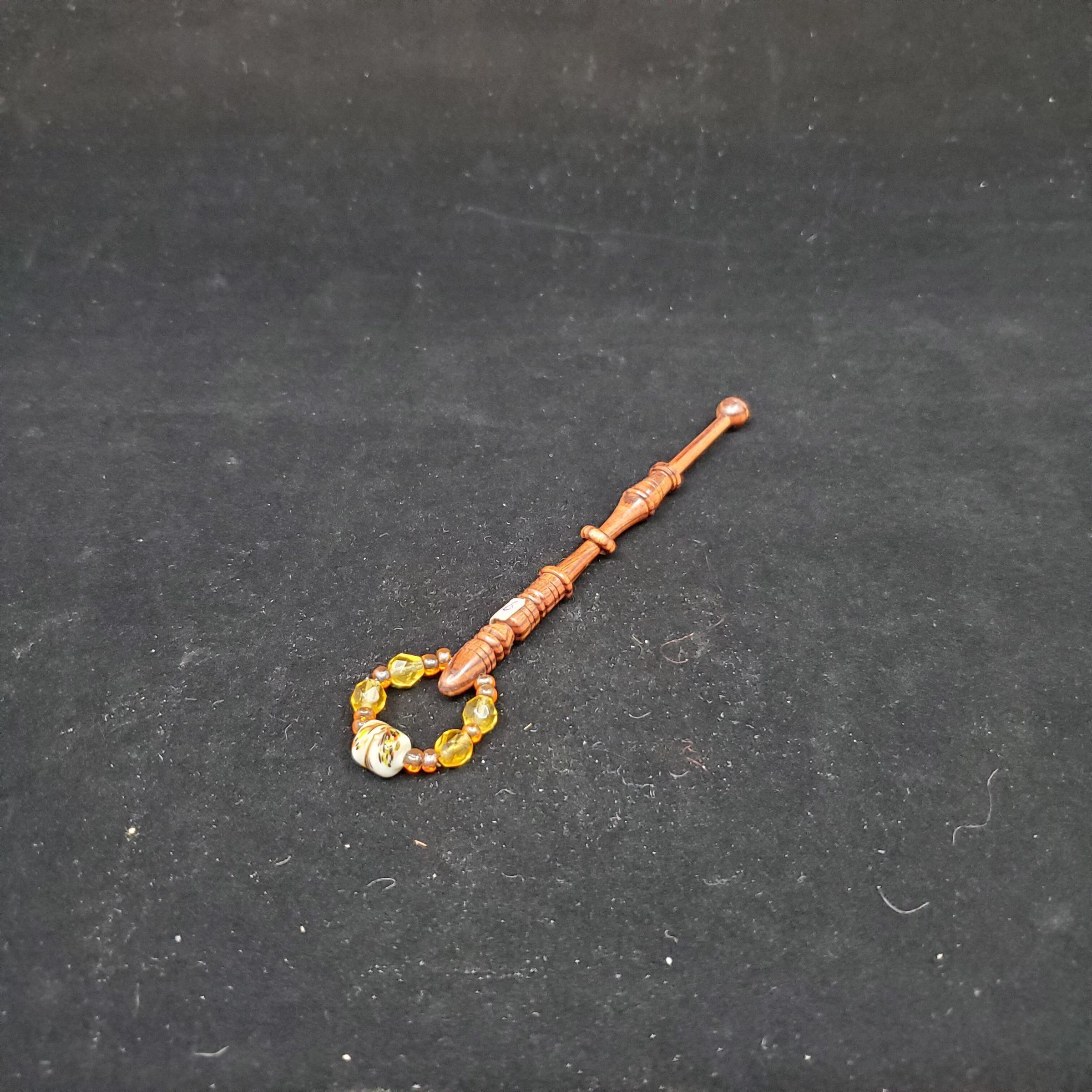 Hand crafted wooden lace bobbin. Red wood. coloured beads for use in making Buckinghamshire lace. Lovely markings in wood.