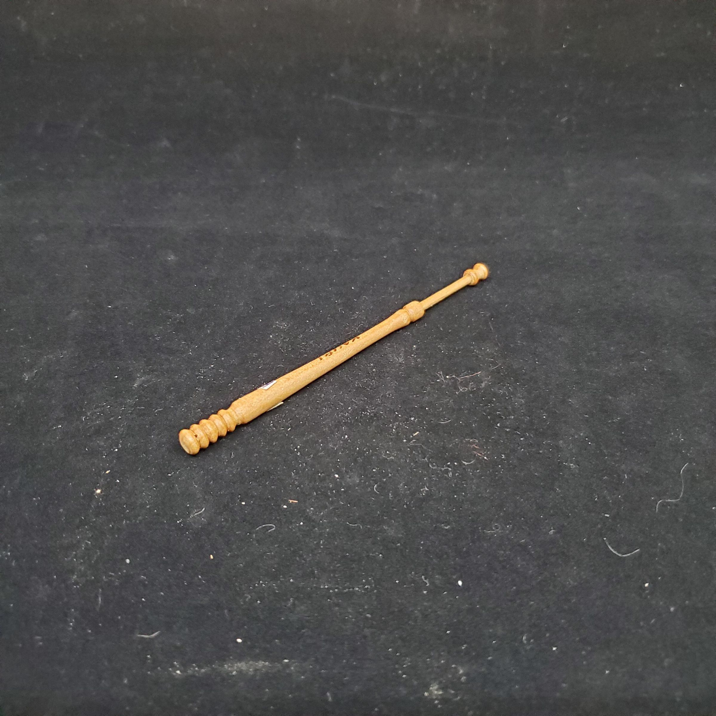 Wooden lace bobbin. Made of Kauri wood, tree grown in New Zealand. Light brown in colour with turnings at one end. ÒKauriÓ in dark brown on side.